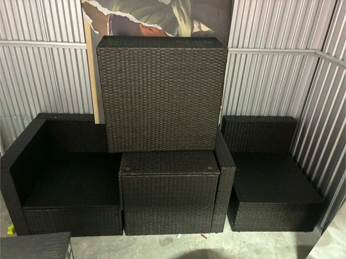 This is a set of brown wicker outdoor furniture. It includes two corner chairs and a storage ottoman. The wicker material is durable for outdoor use.