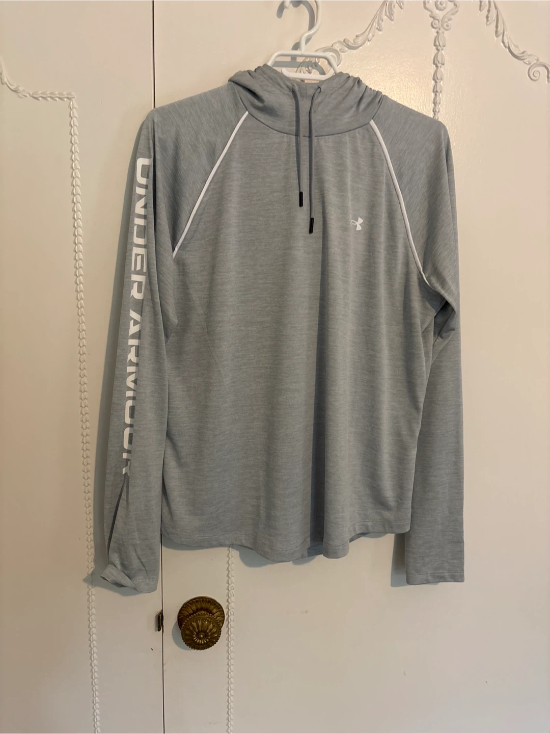 Lightweight Under Armour hoodie in a nice light grey colour. Under Armour logo is on the sleeve and chest. Smoke free home.