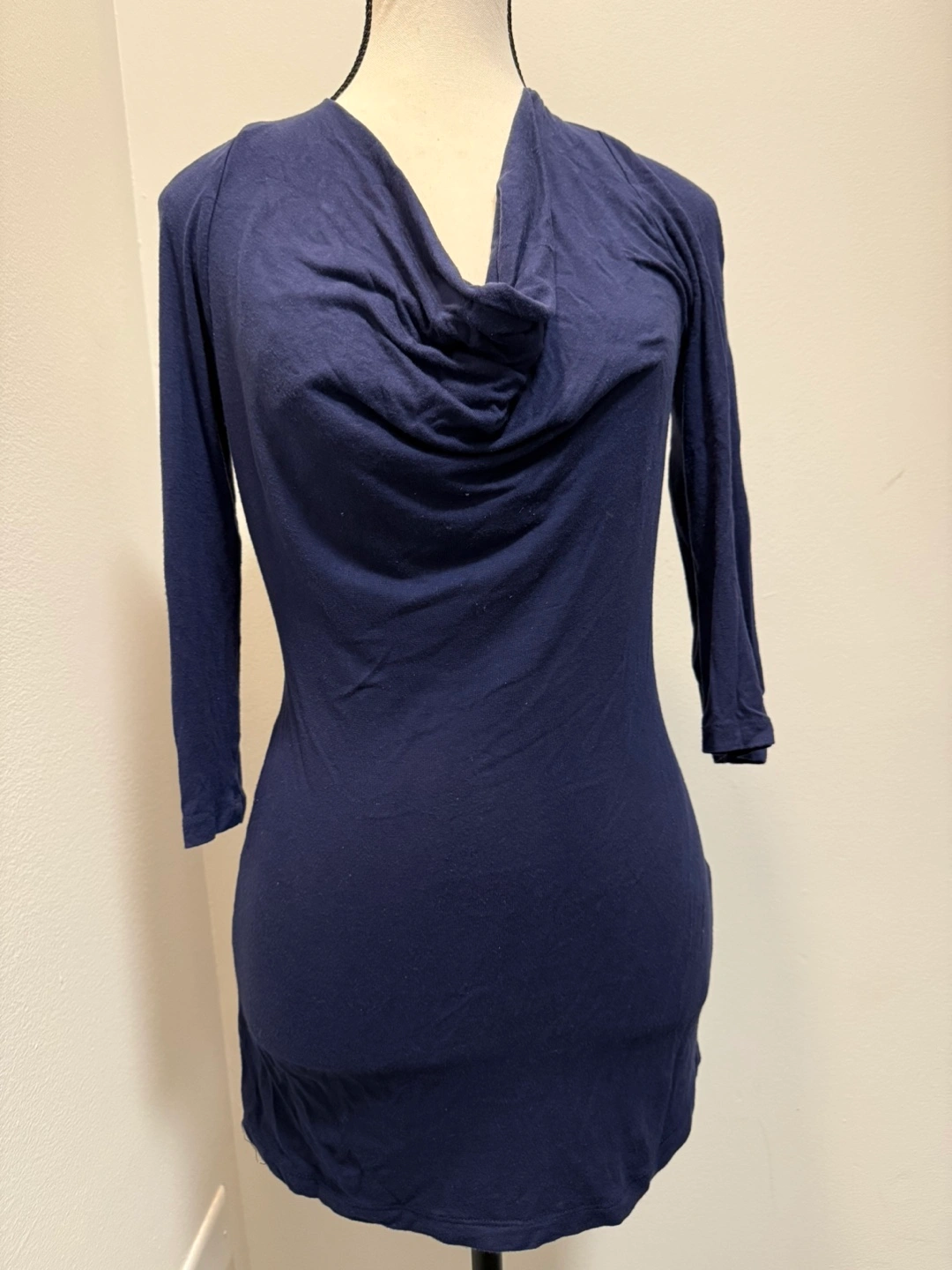 Navy blue cowl neck top. Three-quarter sleeves. Open back with tie detail. Size small. Soft material. Cash and pick up.