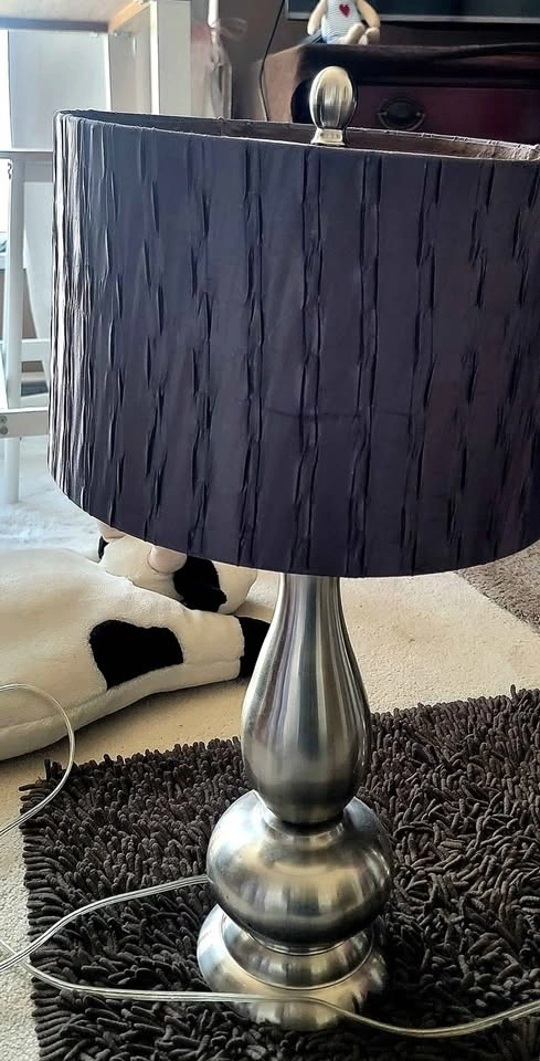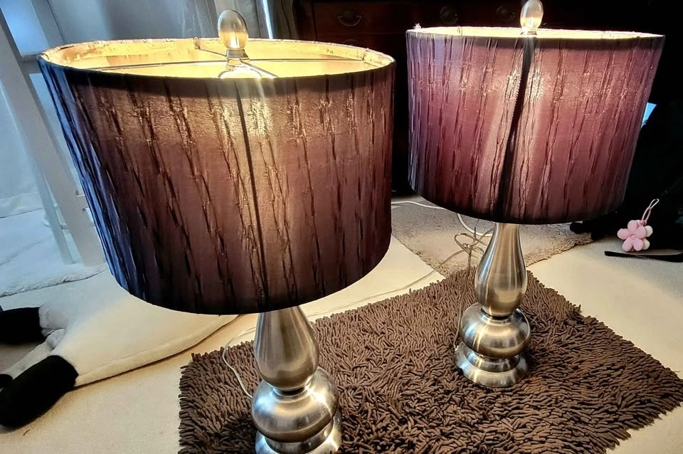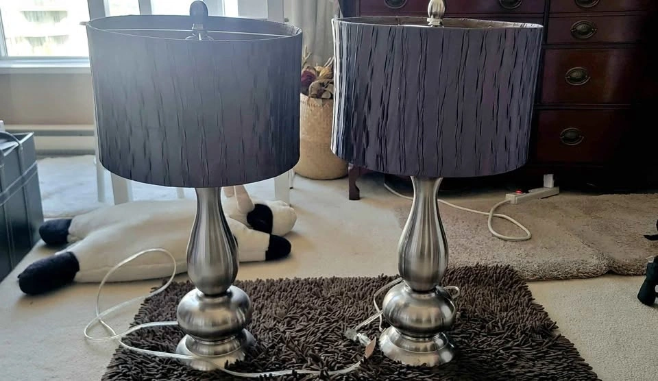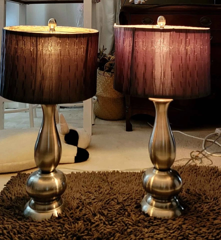 Elegant classic lamps with purplish-brown pleated shades and stainless steel bases. Perfect for adding a soft, cozy glow to your space. In great working condition! $30 for both.