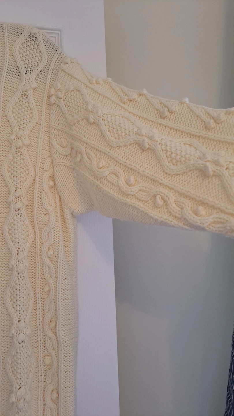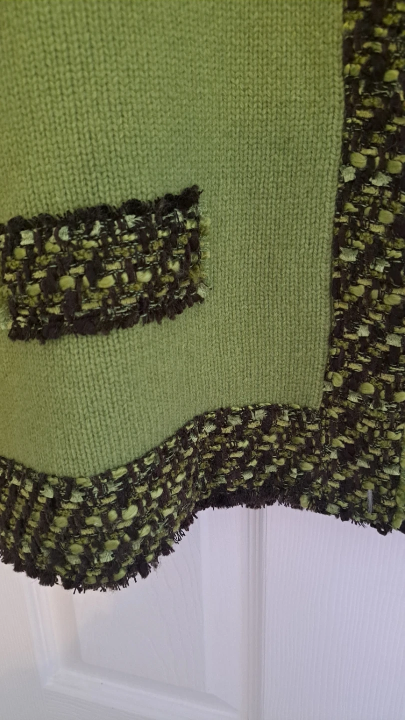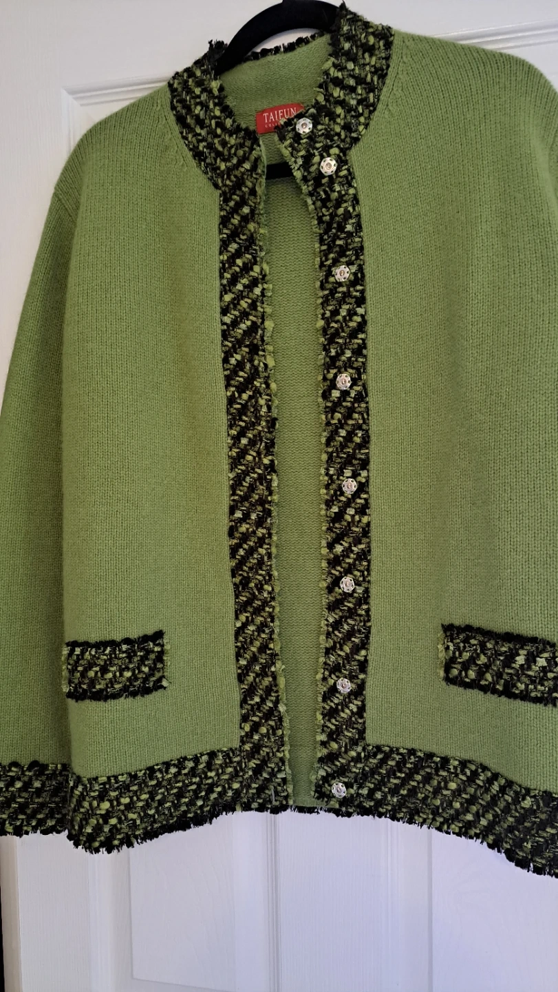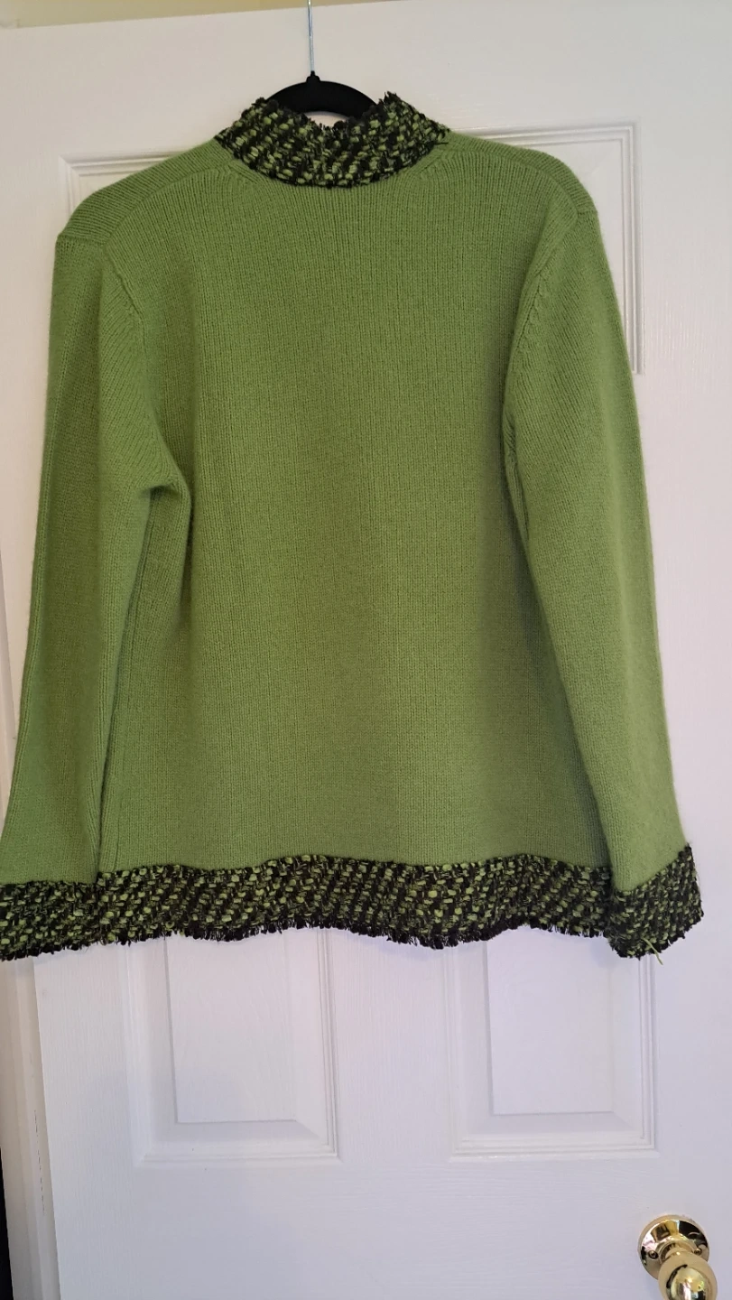 A cozy green knit cardigan featuring a textured trim on the collar, cuffs, and pockets. It's designed with a classic button-up front. This cardigan is great for layering over outfits.it's made from wool.