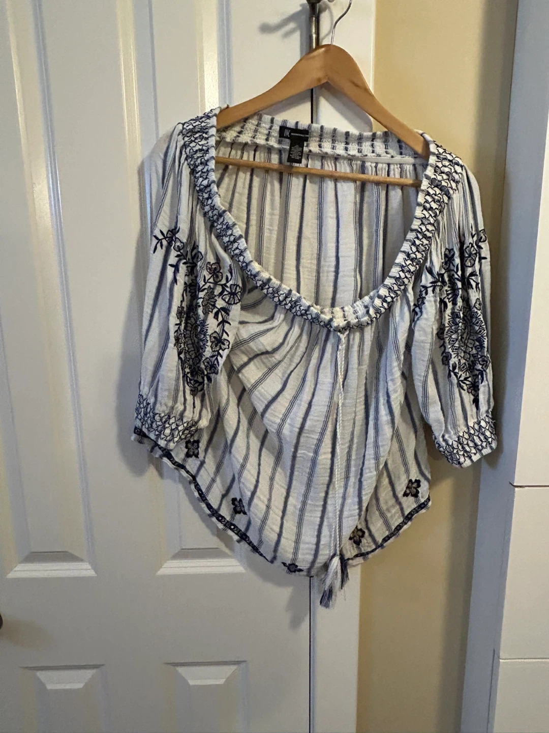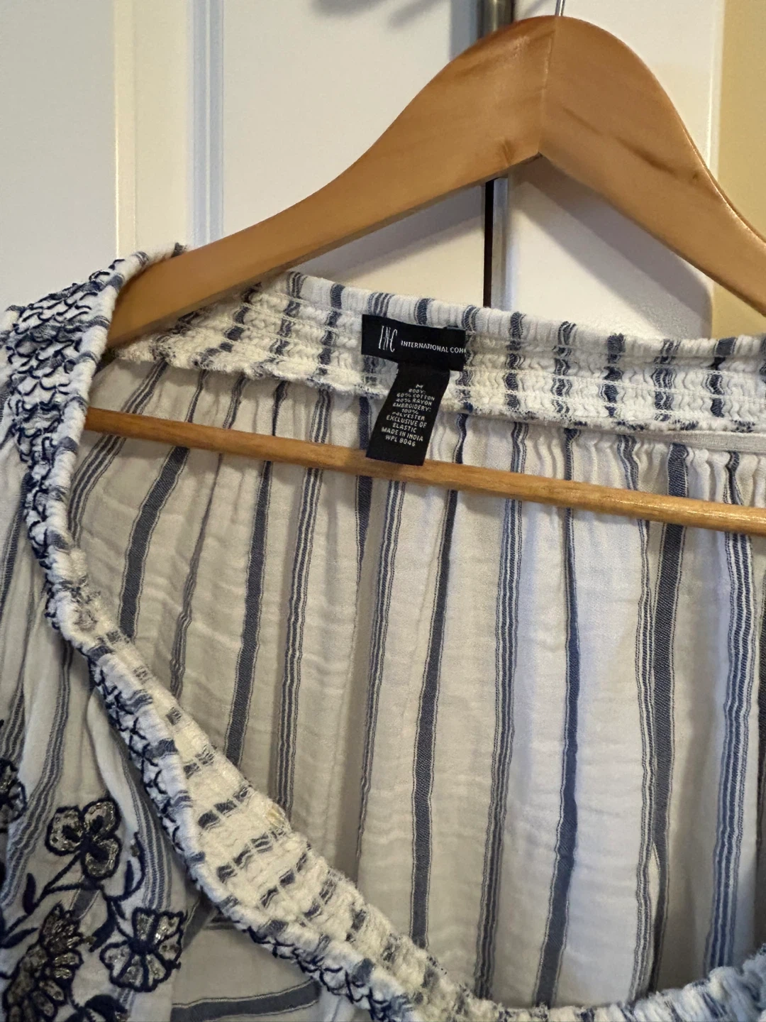 This INC International Concepts top is off-the-shoulder with blue and white stripes. It features intricate blue embroidery with some subtle metallic thread accents. The fabric is lightweight and the neckline is elasticized.