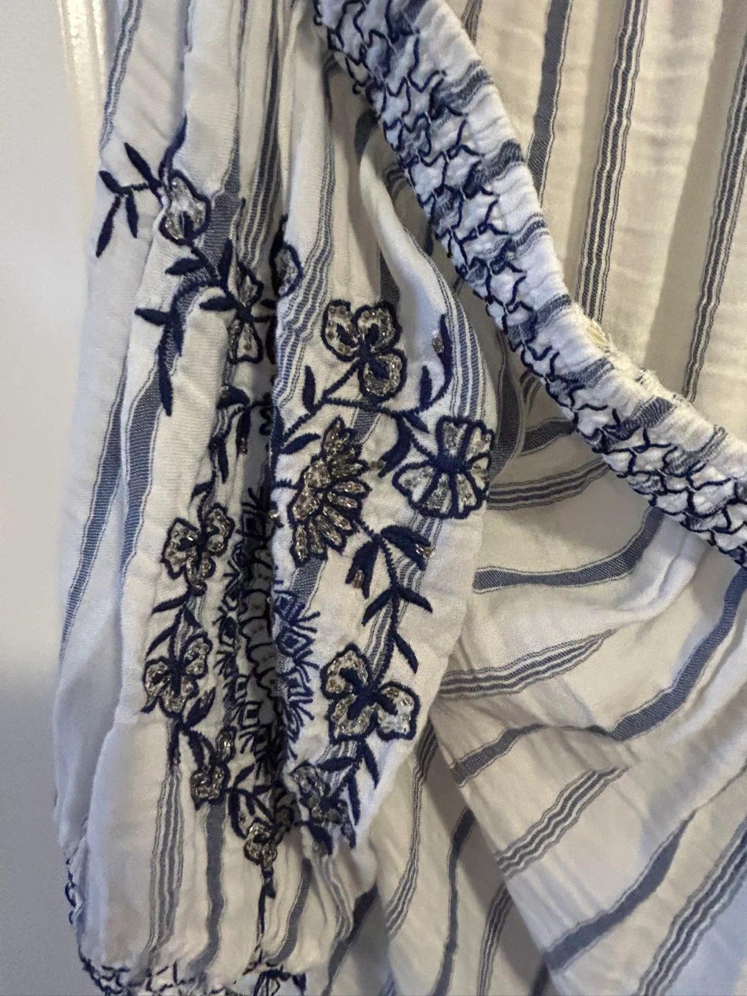 This INC International Concepts top is off-the-shoulder with blue and white stripes. It features intricate blue embroidery with some subtle metallic thread accents. The fabric is lightweight and the neckline is elasticized.