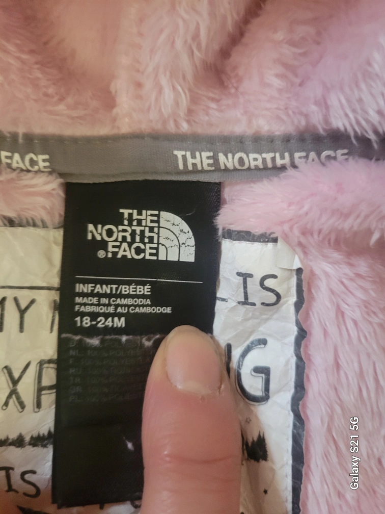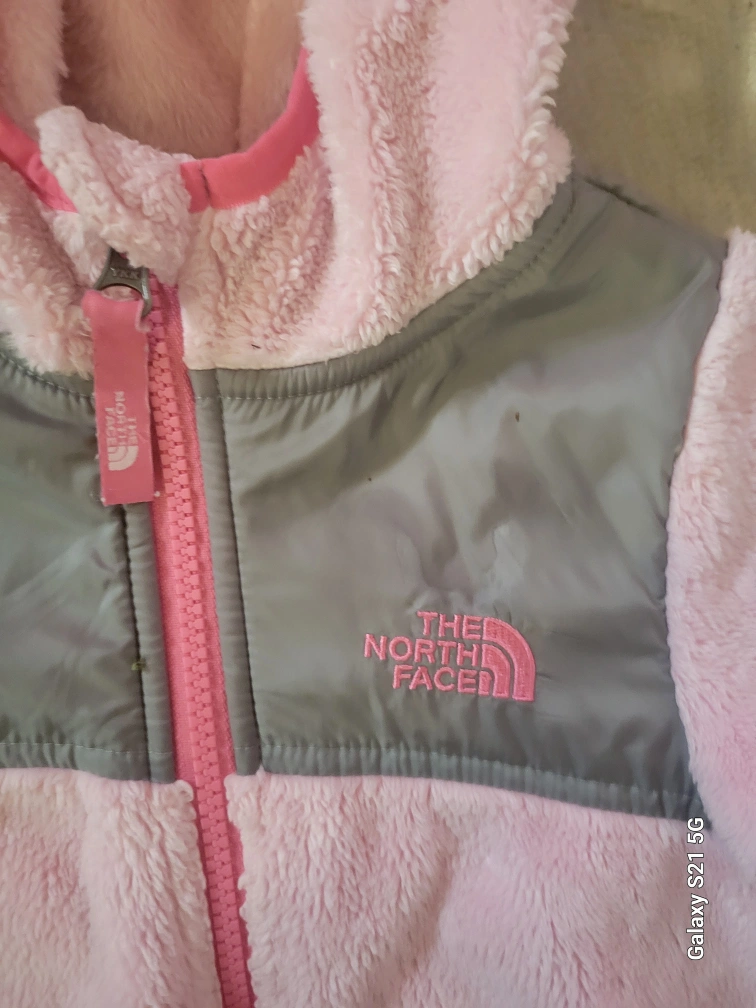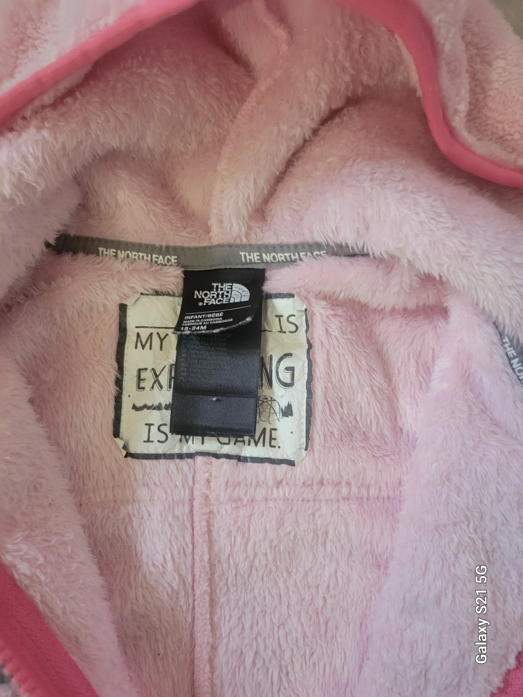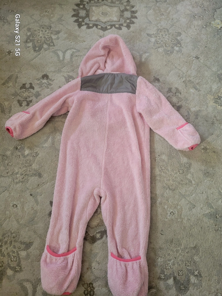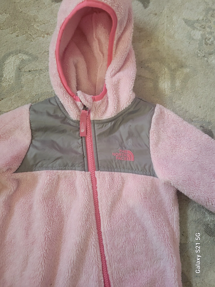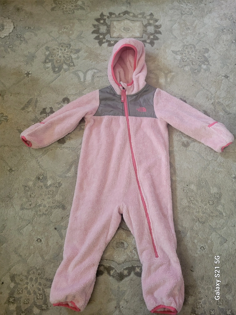 Gorgeous Northface Girls Pink fleece jumpsuit with a hood. Zipper closure. Two pockets on the bottom. Size 18-24 months.