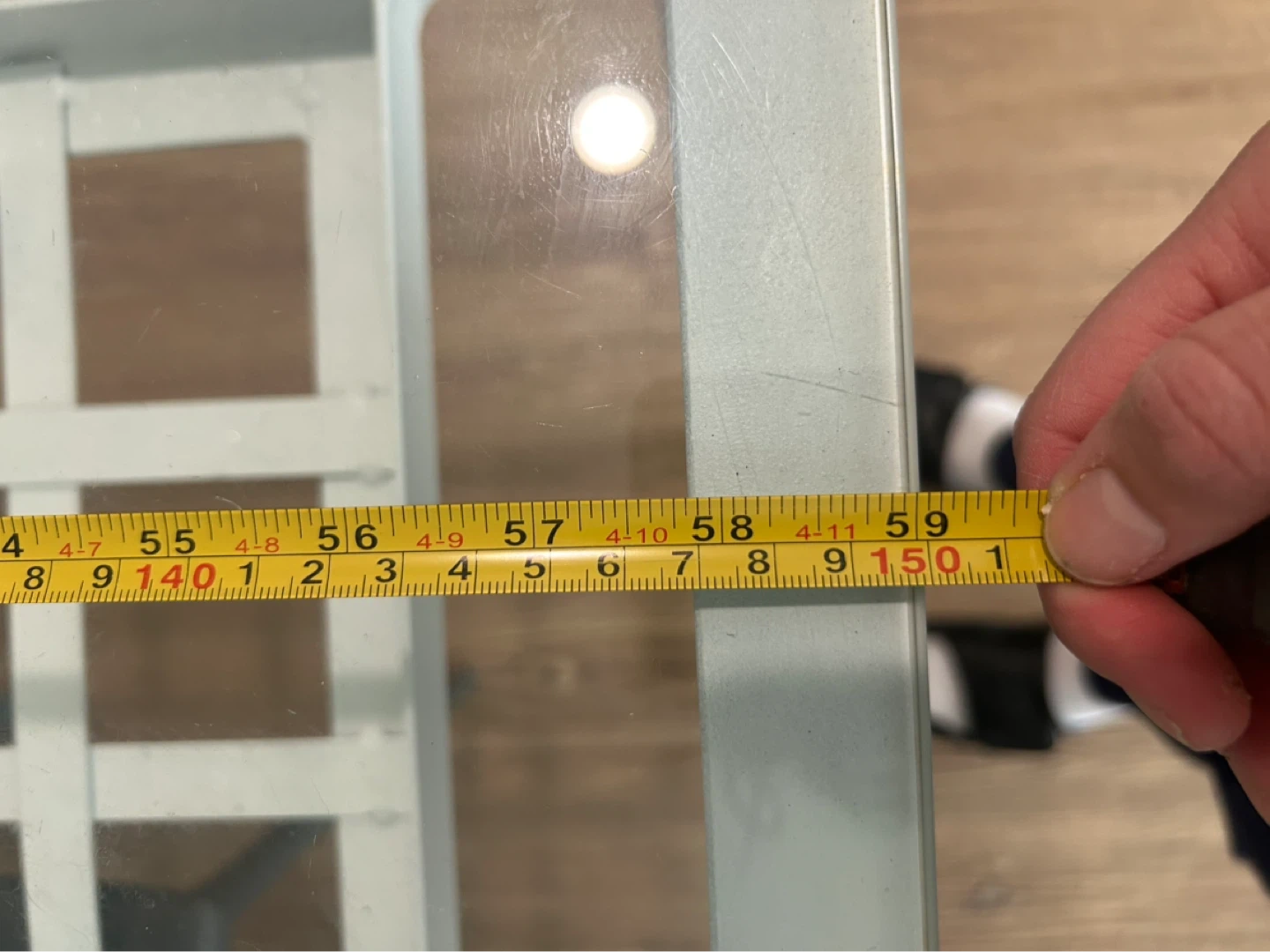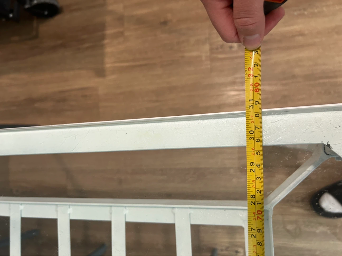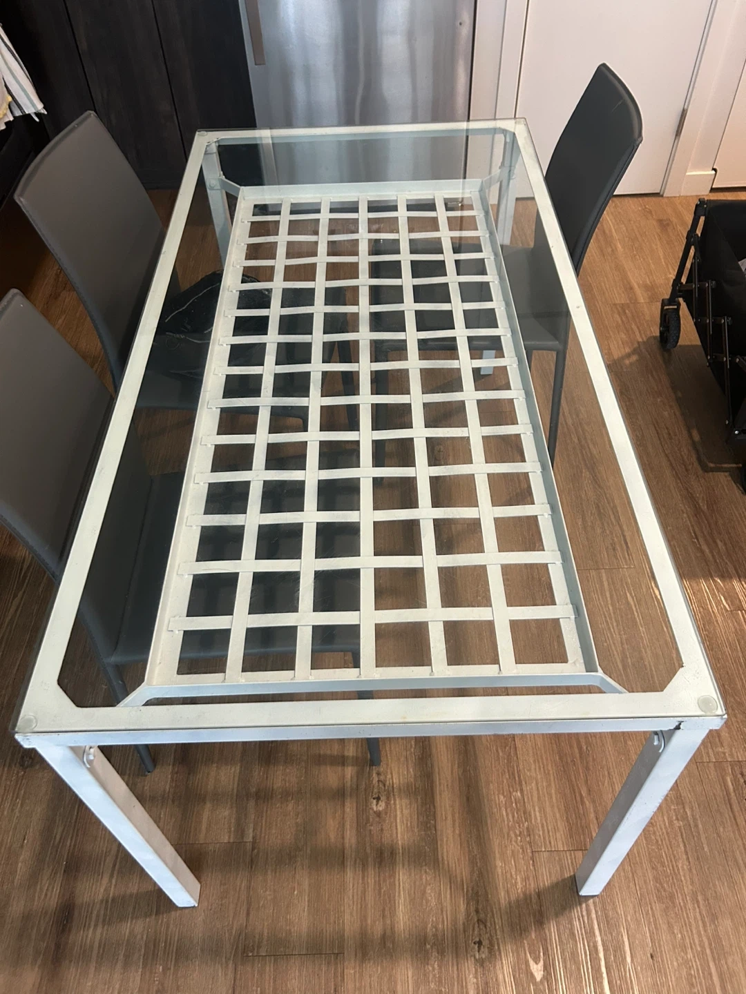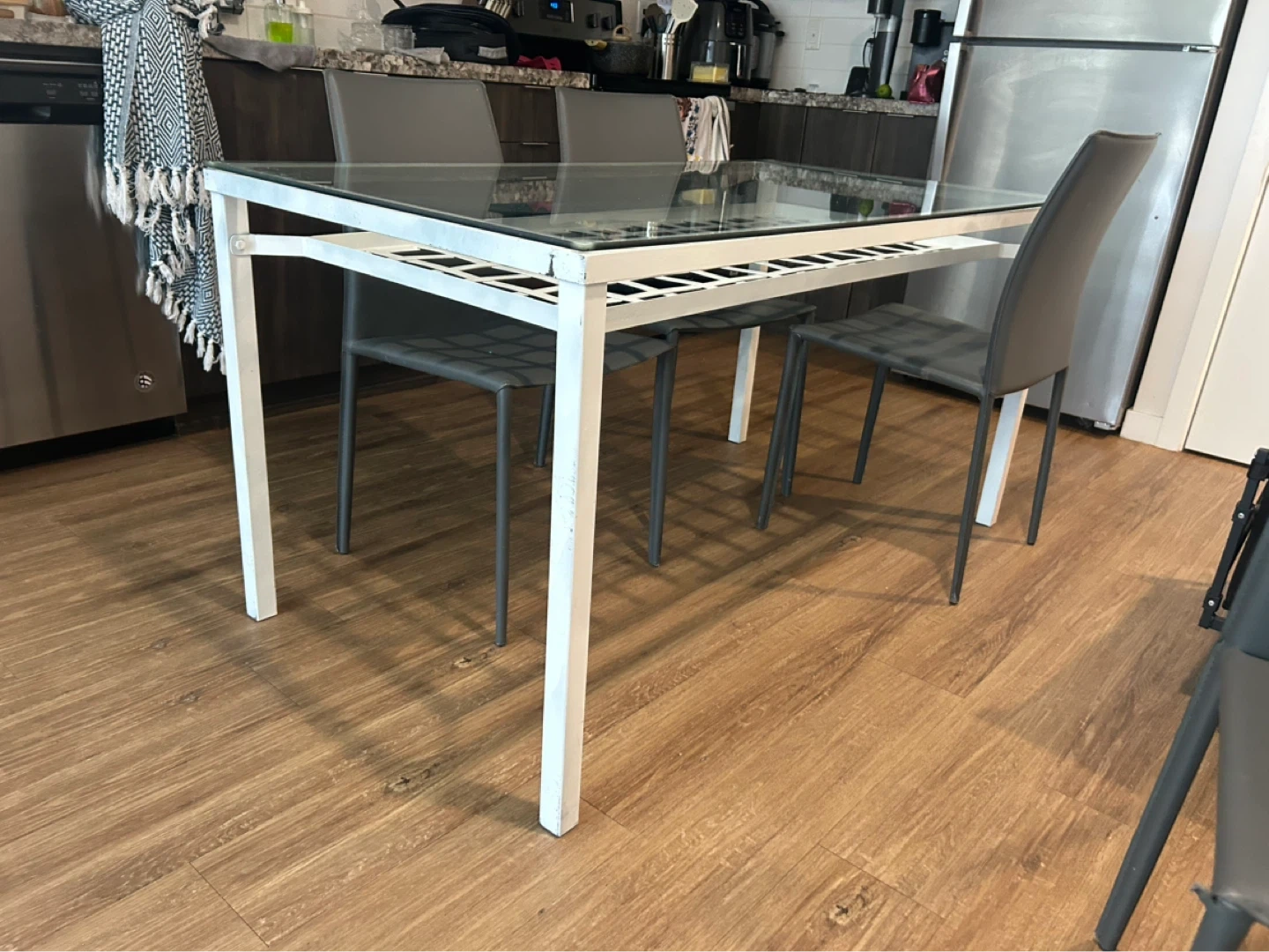 White metal frame dining or garden table with a clear glass top. It's approximately 59 inches long and 31 inches tall. This table's clean lines make it a versatile addition