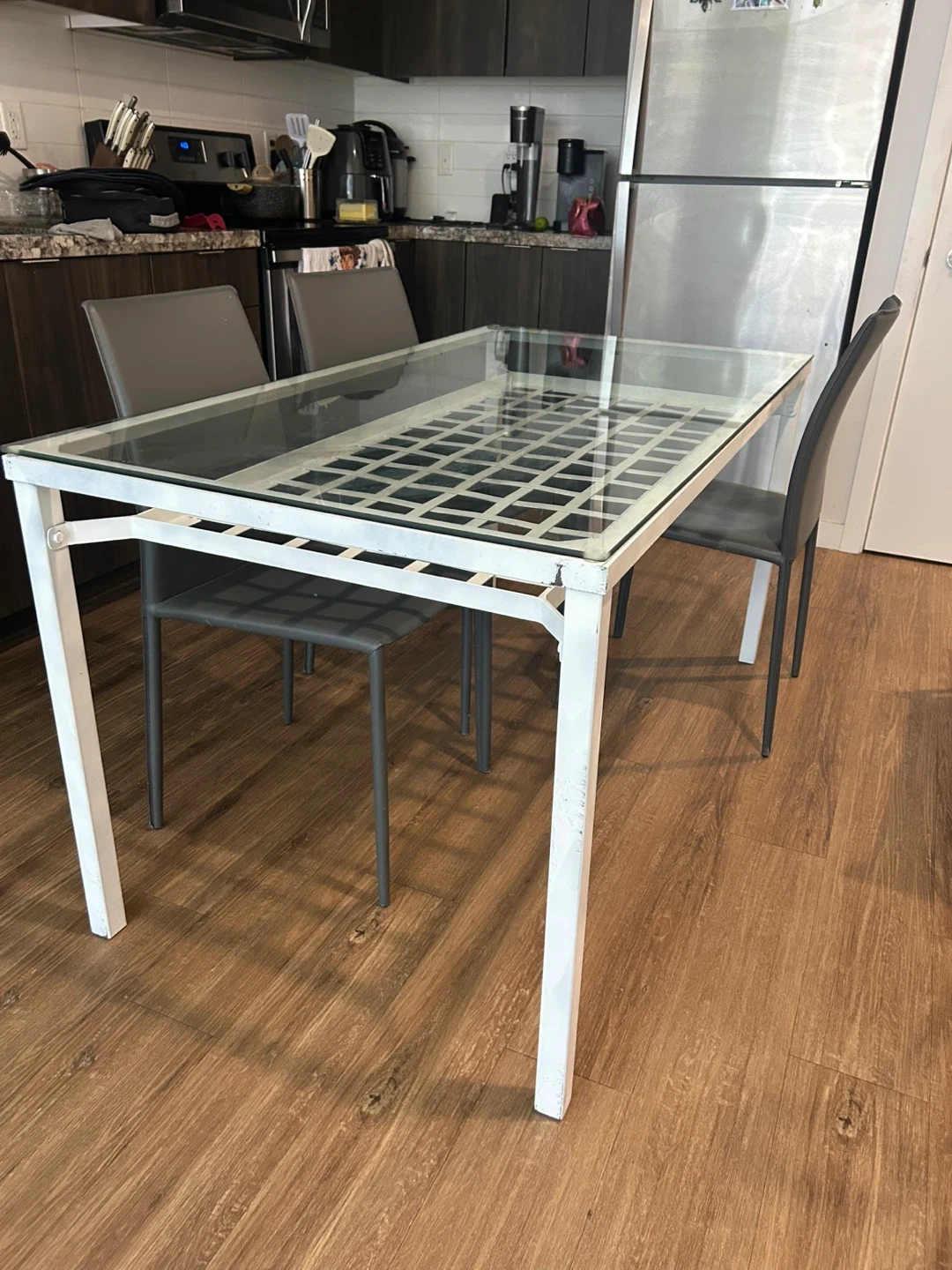 White metal frame dining or garden table with a clear glass top. It's approximately 59 inches long and 31 inches tall. This table's clean lines make it a versatile addition