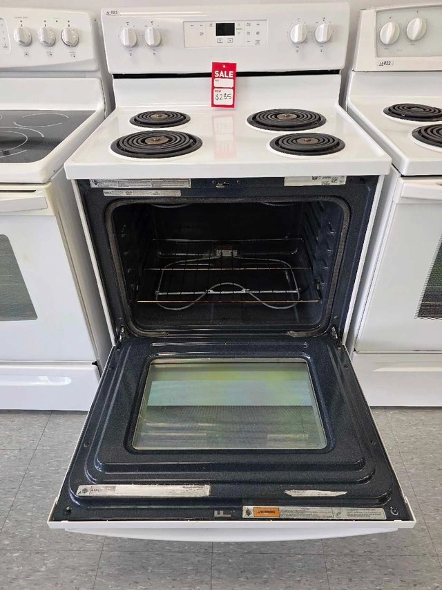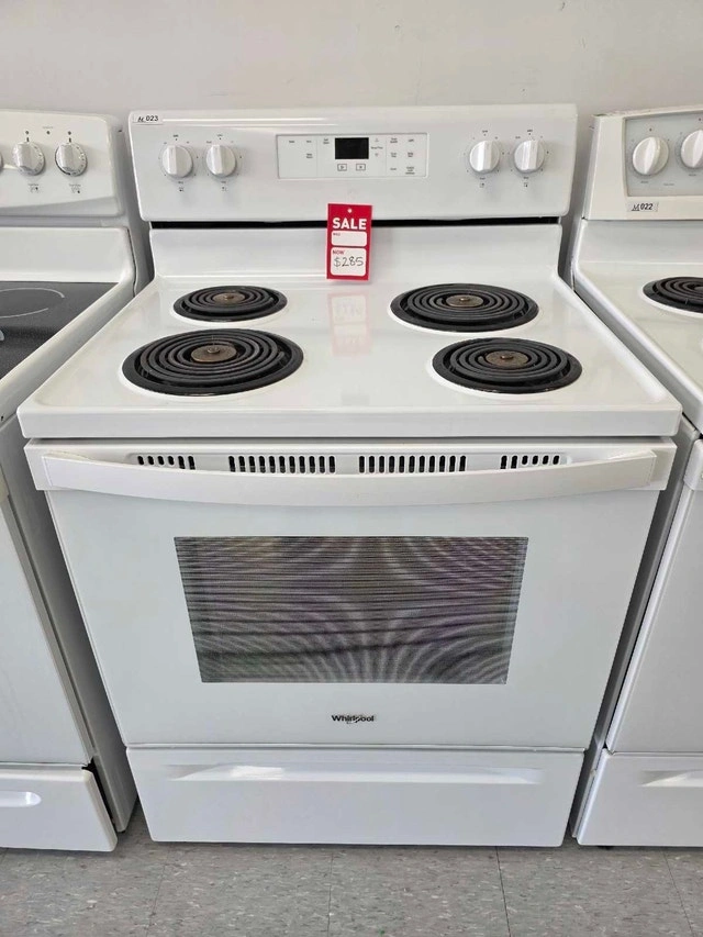 Whirlpool Electric Range – $285 CAD. 3-MONTH WARRANTY included. Professional installation available. Old appliance disposal available. RANGE – Whirlpool YWFC315S0JW3 • 30" wide | Color: White | Freestanding • 4.8 cu. ft. oven capacity • 4 coil burners (2,400W highest element) • Keep Warm setting • Adjustable Self-Cleaning Technology • Closed Door Broiling • Upswept SpillGuard™ cooktop (raised edges) • Large oven window • Control Lock mode • Storage drawer • 2 oven racks • Electric (240V). Feel free to message if you have any questions!