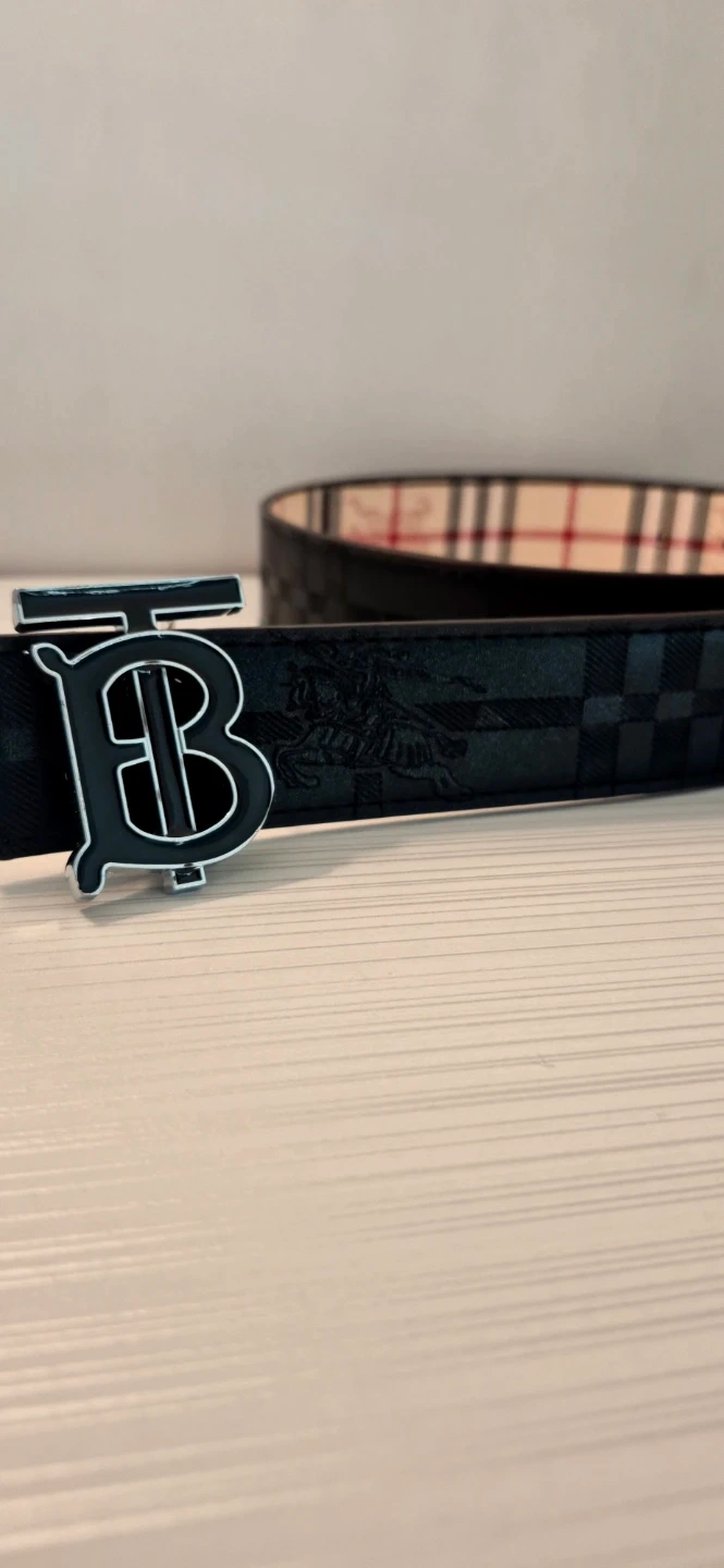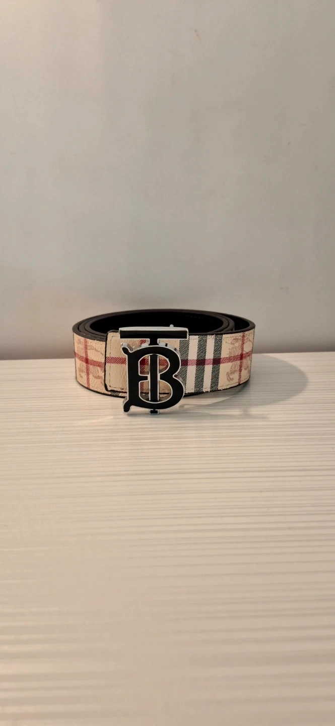 This is a Burberry reversible leather strap belt. It features the iconic Burberry check pattern on one side and a black checkered pattern on the other. It comes with the original box, dust bag, and authenticity card. This belt is a stylish accessory for any outfit!