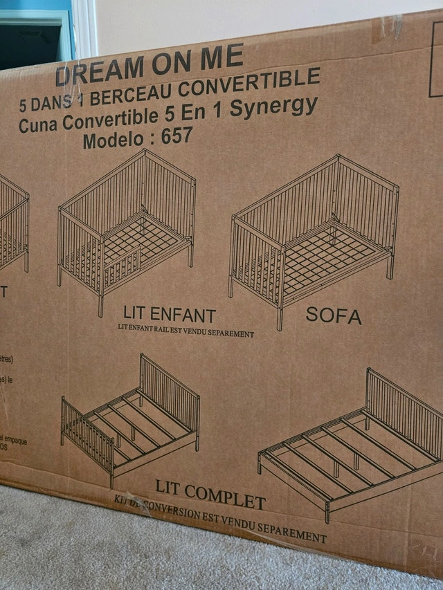 Selling a Dream On Me Synergy 5-in-1 Convertible Crib in excellent, like-new condition. Rarely used. Converts from crib to toddler bed to daybed (grows with your child). Solid wood construction – sturdy and safe. Clean and well maintained. From a smoke-free home. Perfect for new parents looking for a high-quality crib at a great price. Mattress sold separately.