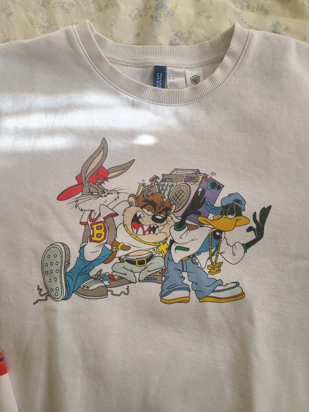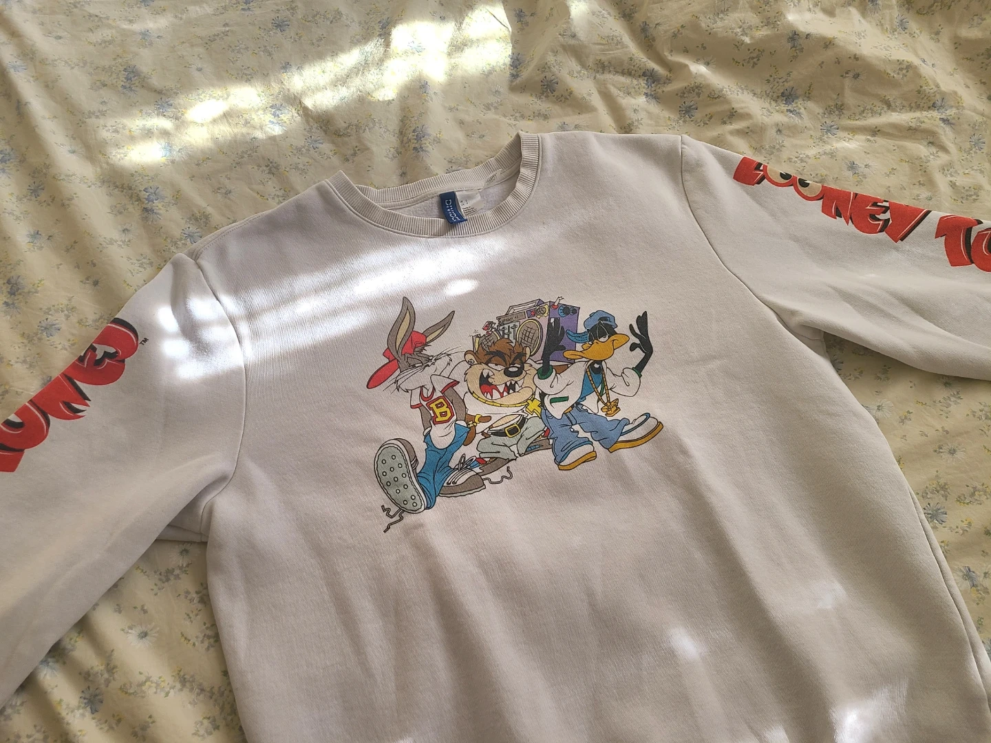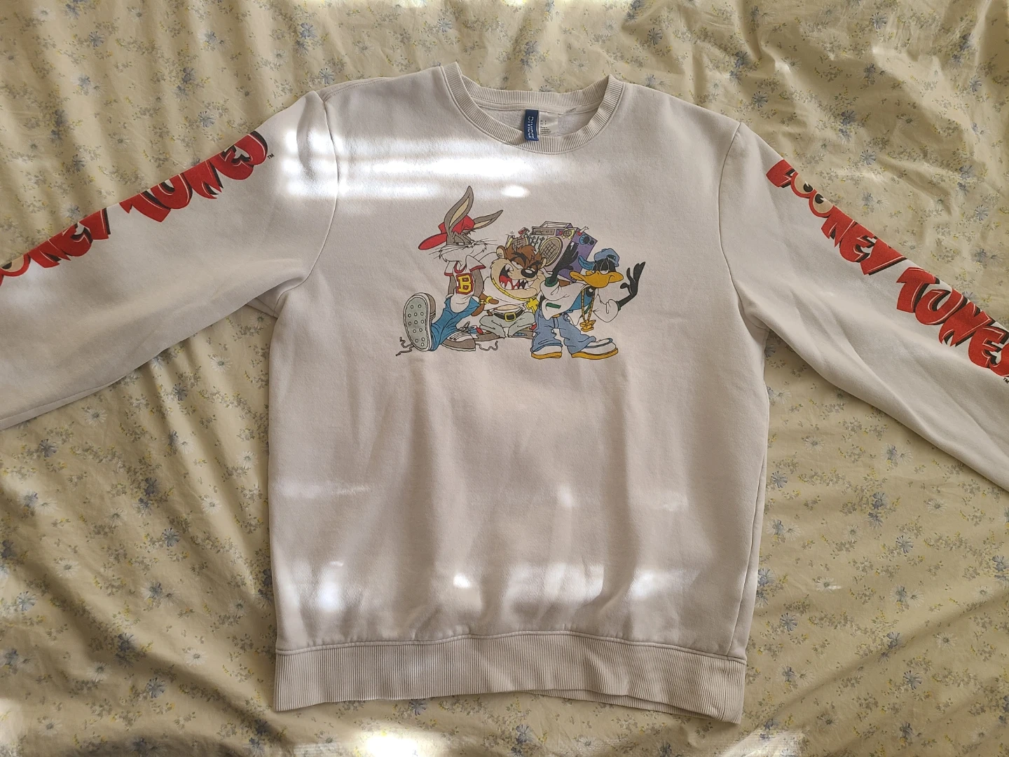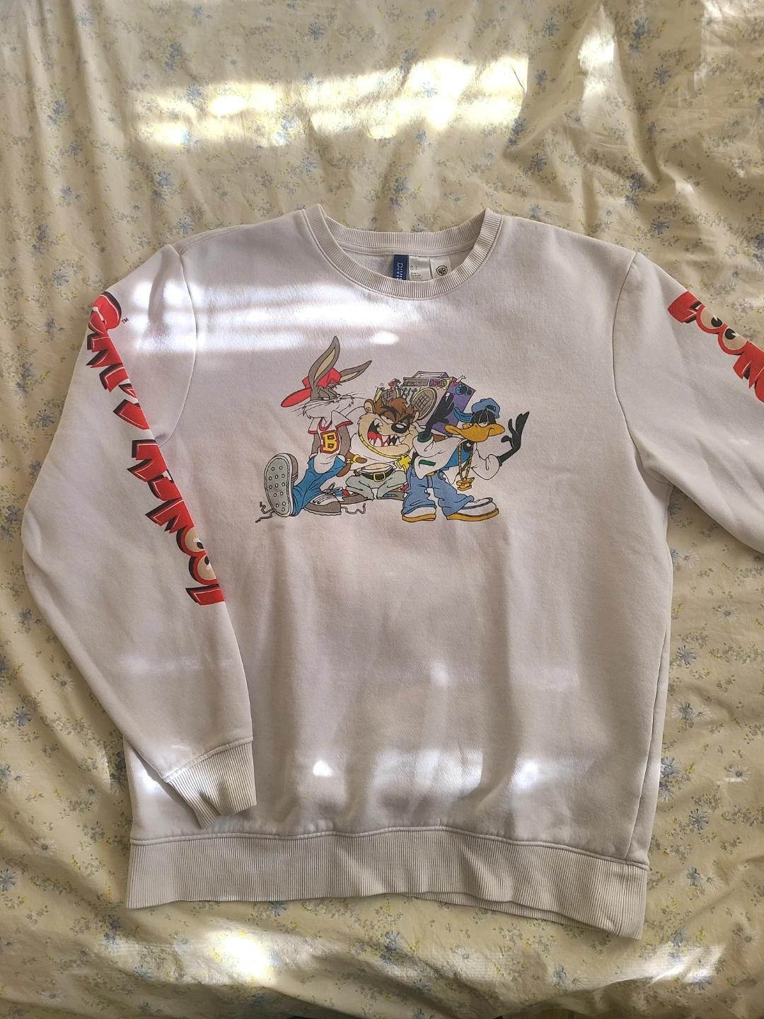 White sweatshirt with a large graphic print of "Looney Tunes" on the front. Made from a soft cotton blend. Like new condition.