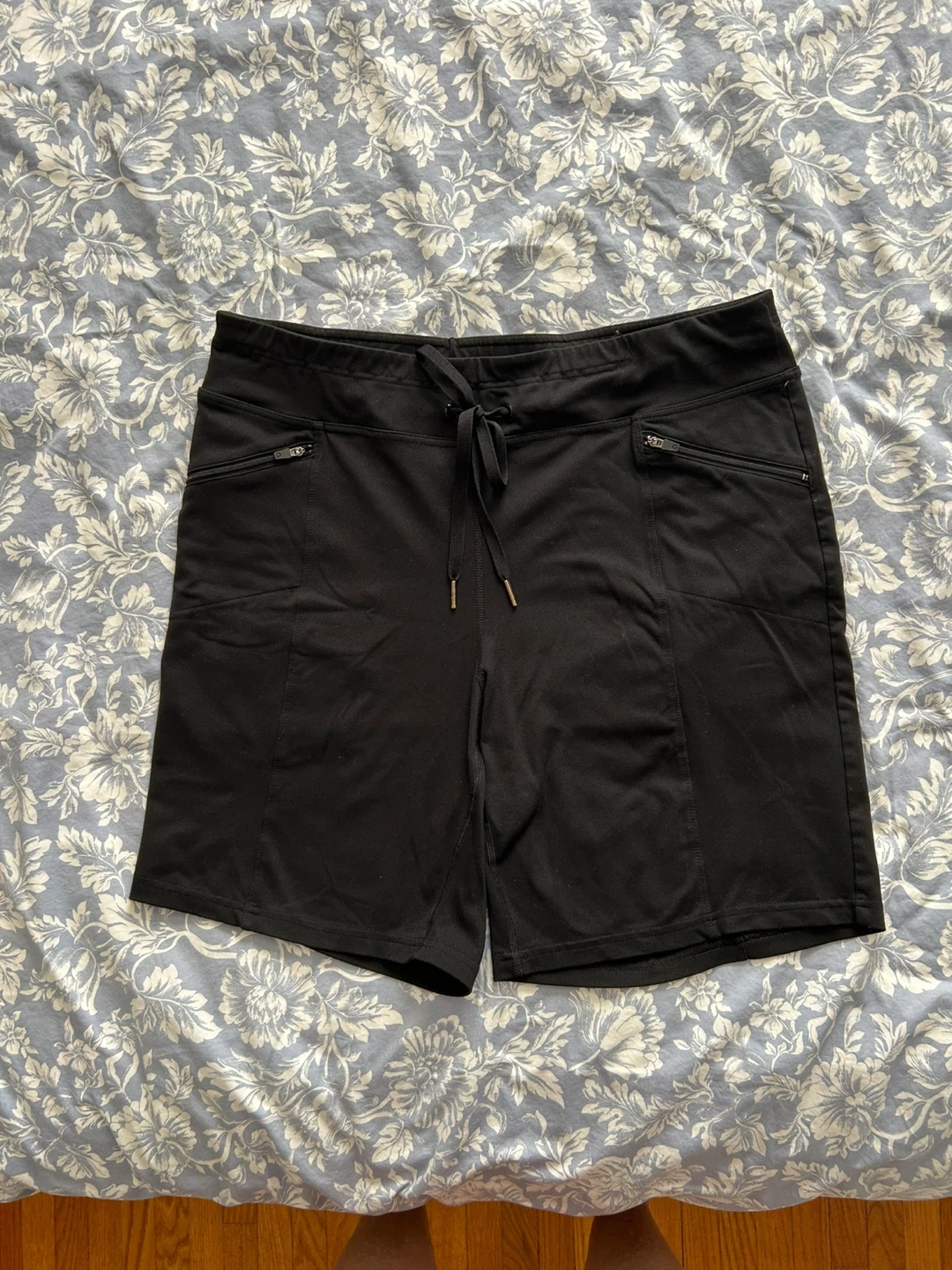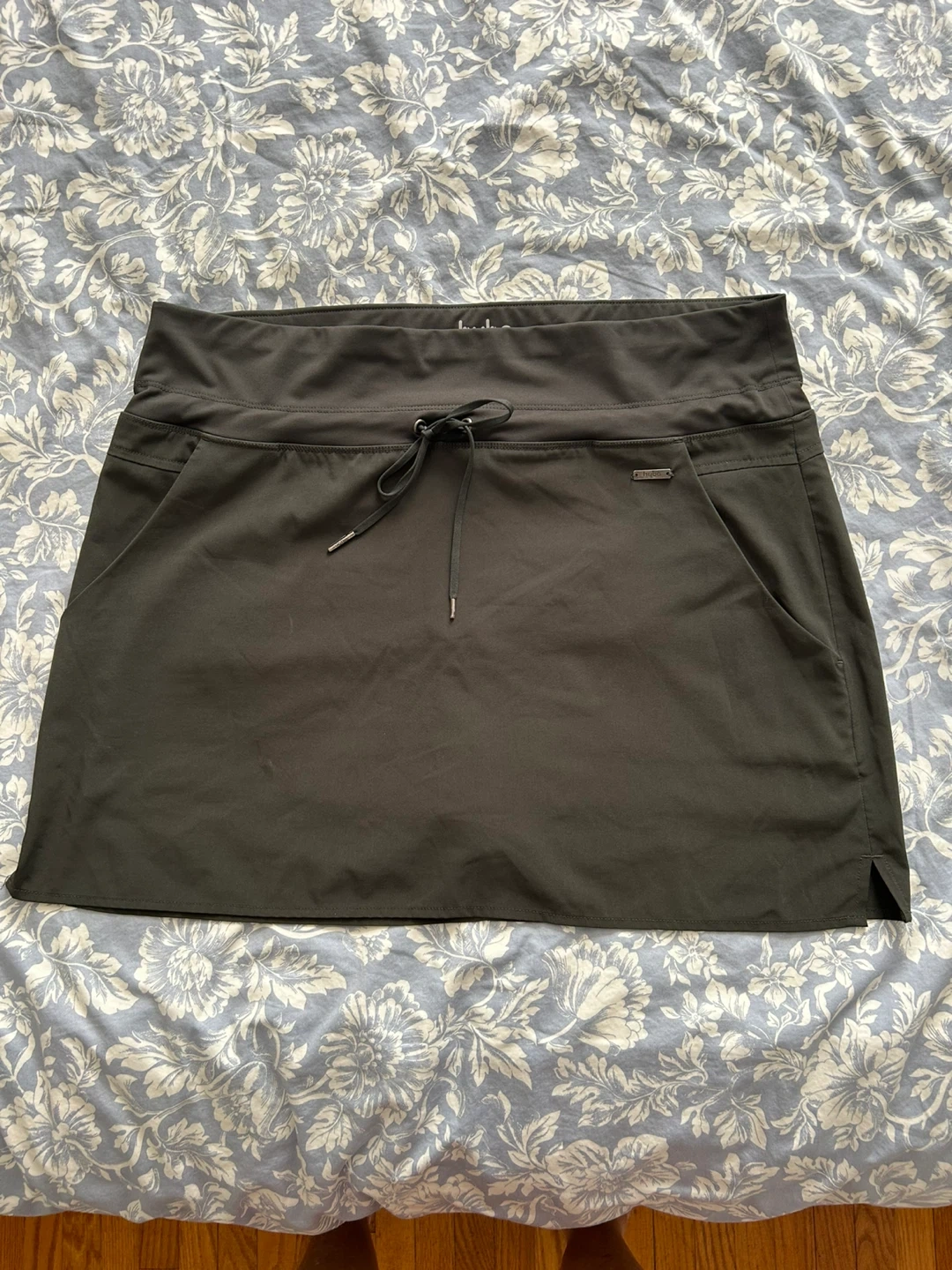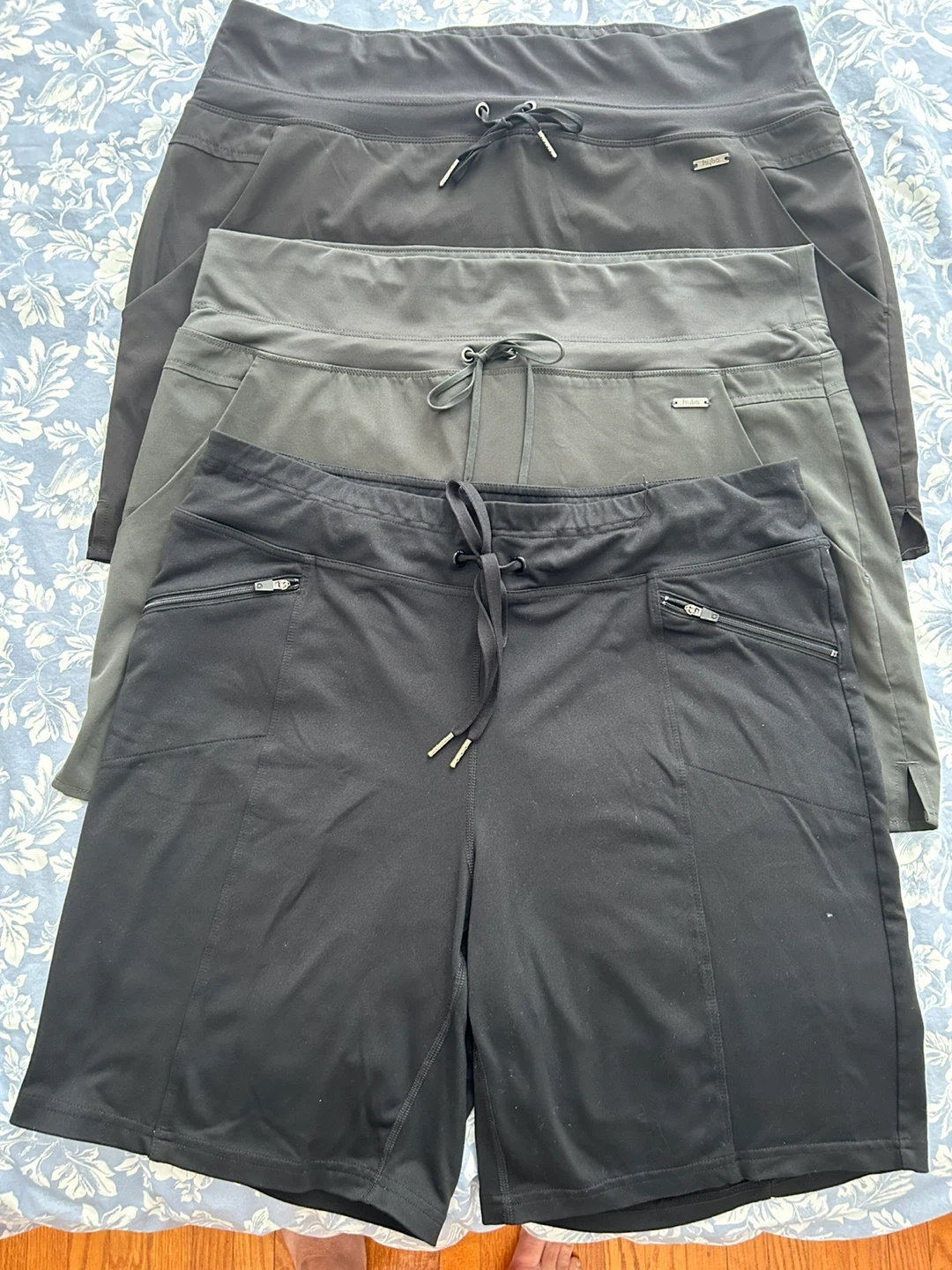 Ladies skorts and shirts, size large, designed for comfort and movement. Skorts are combo skirt + shorts underneath, 1 black, 1 dark grey. Shorts are black. Features include stretch waistband with a drawstring and pockets. Hyba brand. Machine washable. In great shape. Brampton, near Queen and Kennedy.