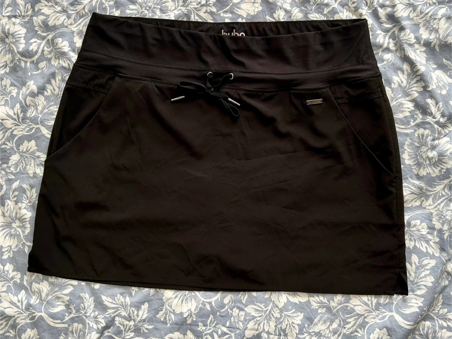 Ladies skorts and shirts, size large, designed for comfort and movement. Skorts are combo skirt + shorts underneath, 1 black, 1 dark grey. Shorts are black. Features include stretch waistband with a drawstring and pockets. Hyba brand. Machine washable. In great shape. Brampton, near Queen and Kennedy.