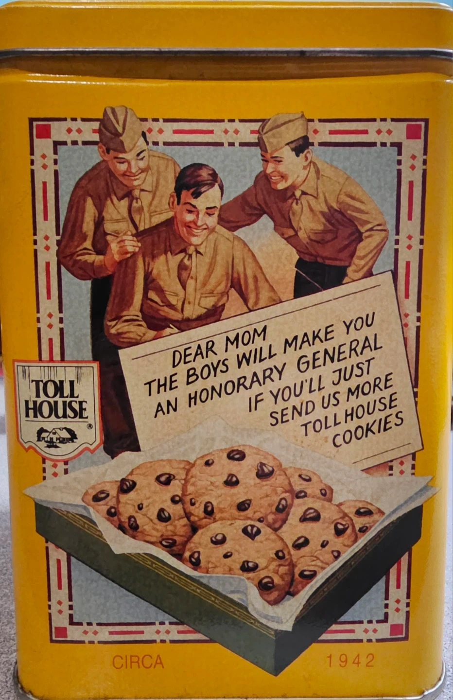 This is a decorative tin featuring vintage artwork related to Toll House cookies. It includes the original recipe for chocolate chip cookies. A great item for collectors!