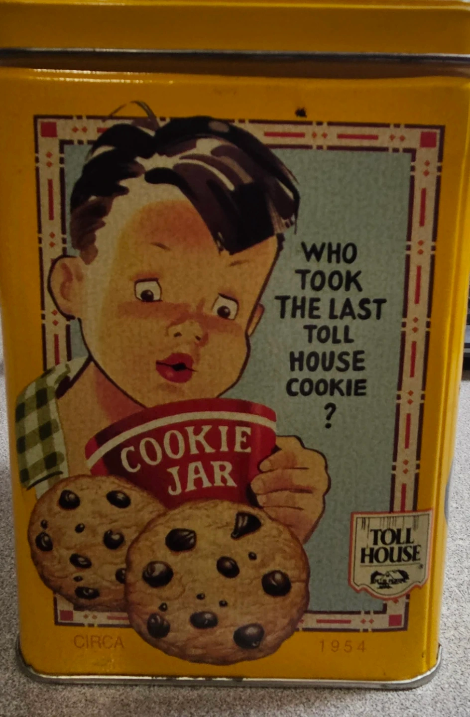 This is a decorative tin featuring vintage artwork related to Toll House cookies. It includes the original recipe for chocolate chip cookies. A great item for collectors!