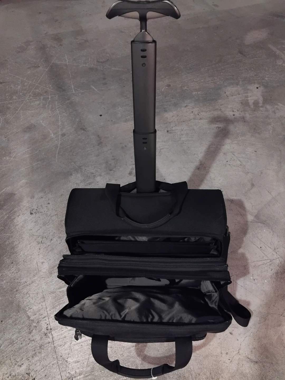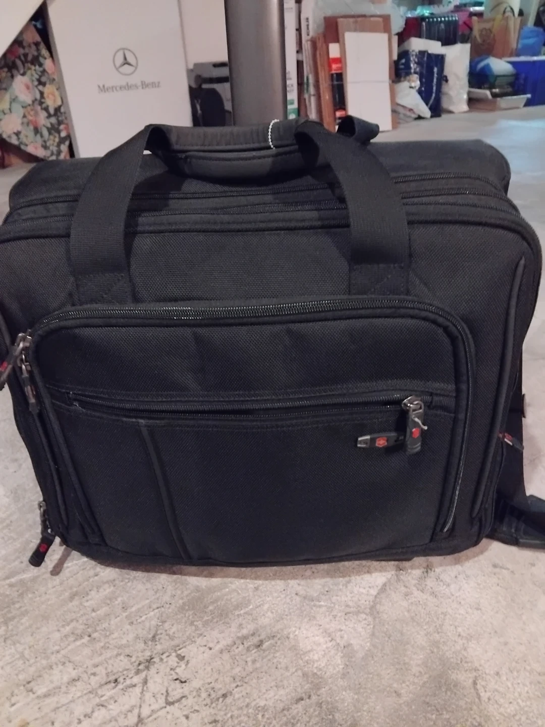 Victorinox rolling briefcase in black. It's made from durable nylon material with a telescoping handle and wheels for easy transport. Multiple compartments offer plenty of storage for your essentials.