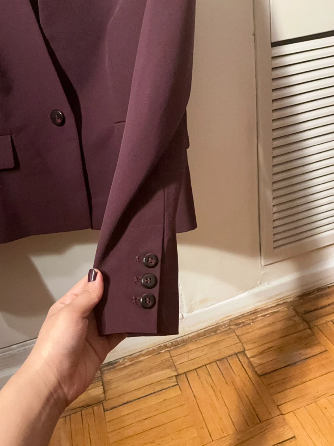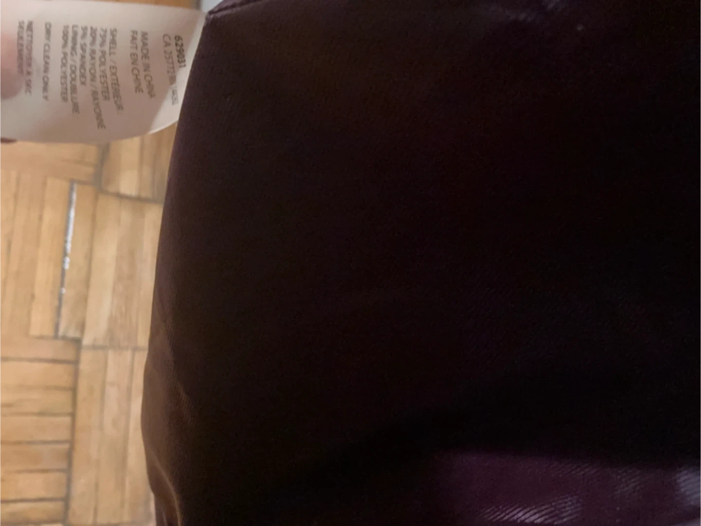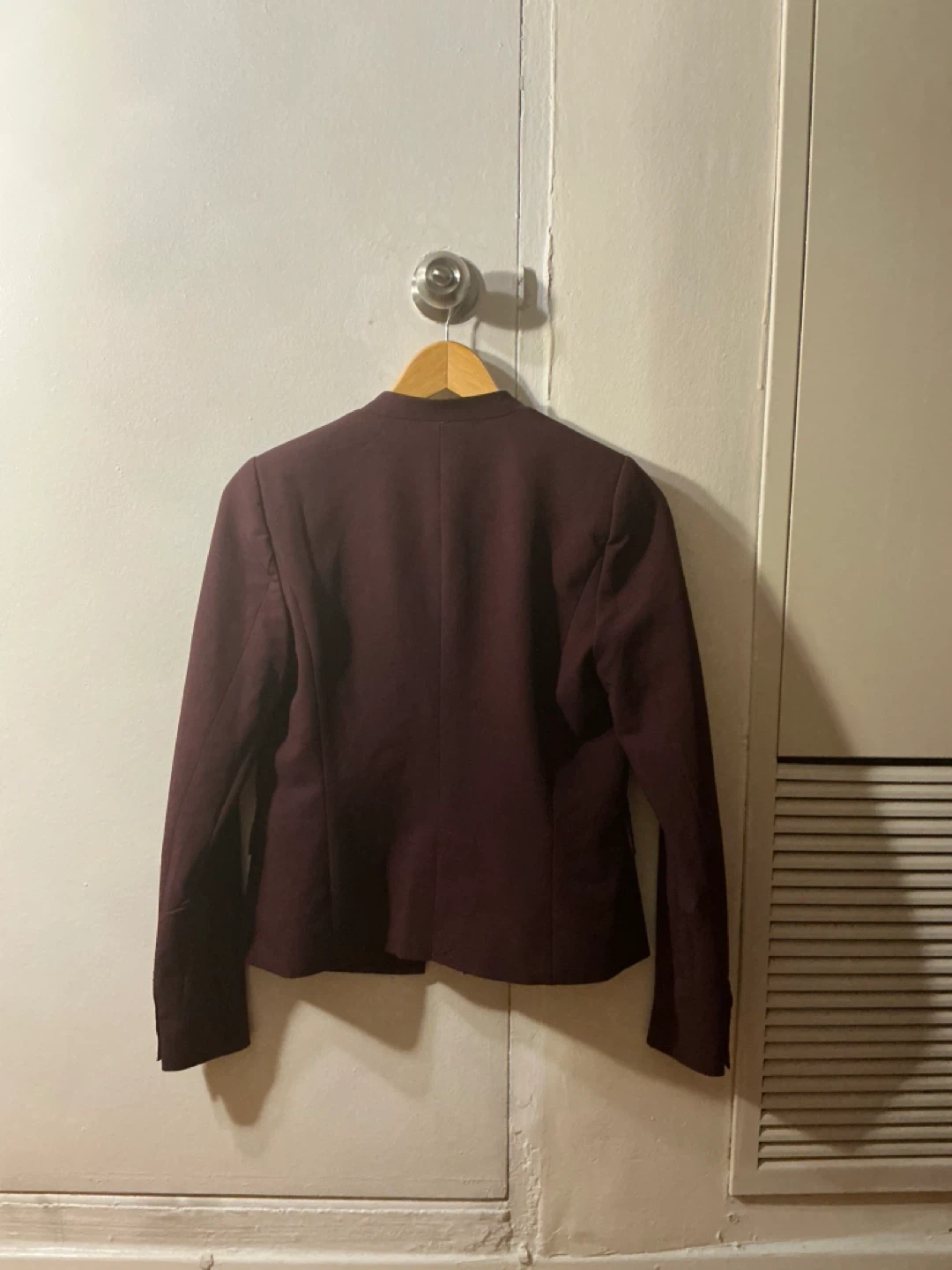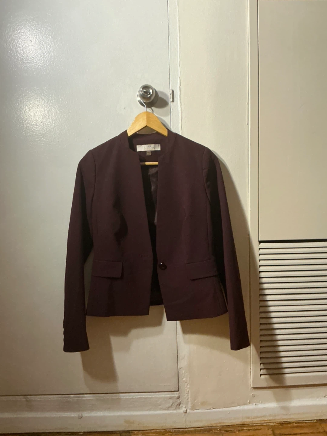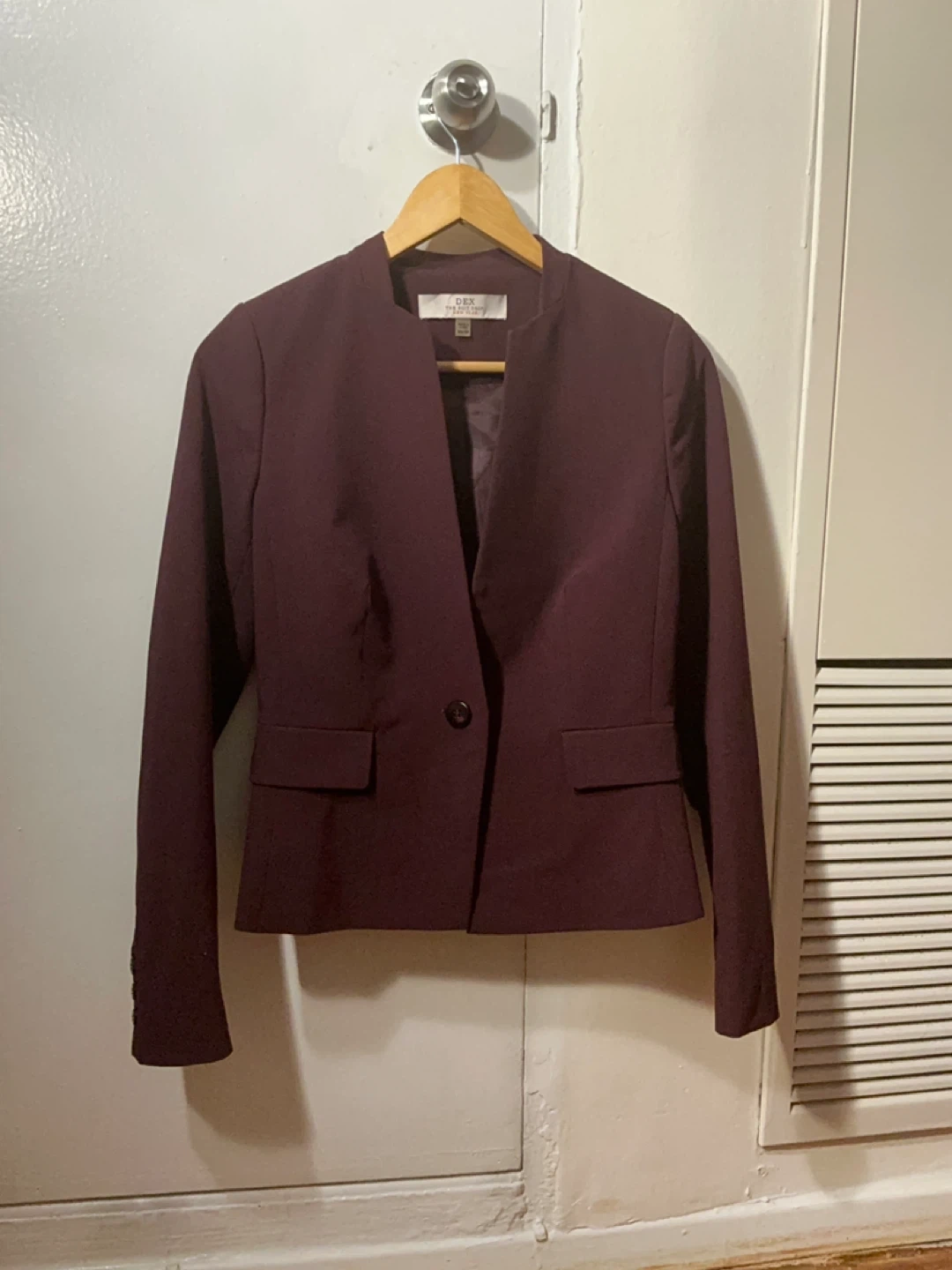 This is a plum coloured DEX blazer. It's made of a polyester and spandex blend. The lining is 100% polyester. It features a single button closure and two front pockets