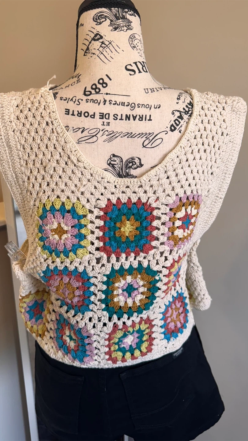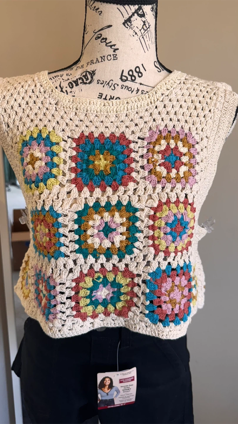 Super cute crochet vest with granny squares! The colours are really vibrant and the fit is comfy. Perfect for layering or wearing on its own during warmer weather.