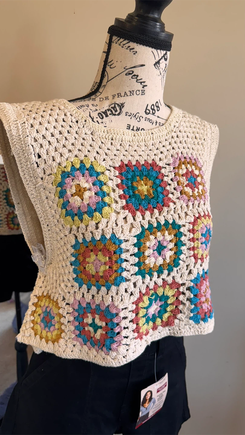 Super cute crochet vest with granny squares! The colours are really vibrant and the fit is comfy. Perfect for layering or wearing on its own during warmer weather.
