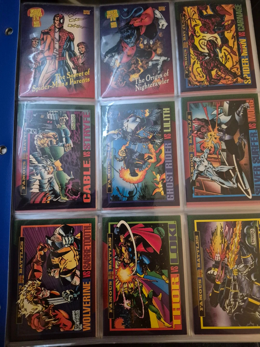 Collection of Marvel Universe trading cards featuring various characters. Cards include 'The Origin of Wolverine', 'The Face of Doctor Doom', and 'The Secret of Spider-Man's Parents'. These cards are from the Unsolved Mysteries and Famous Battles series.