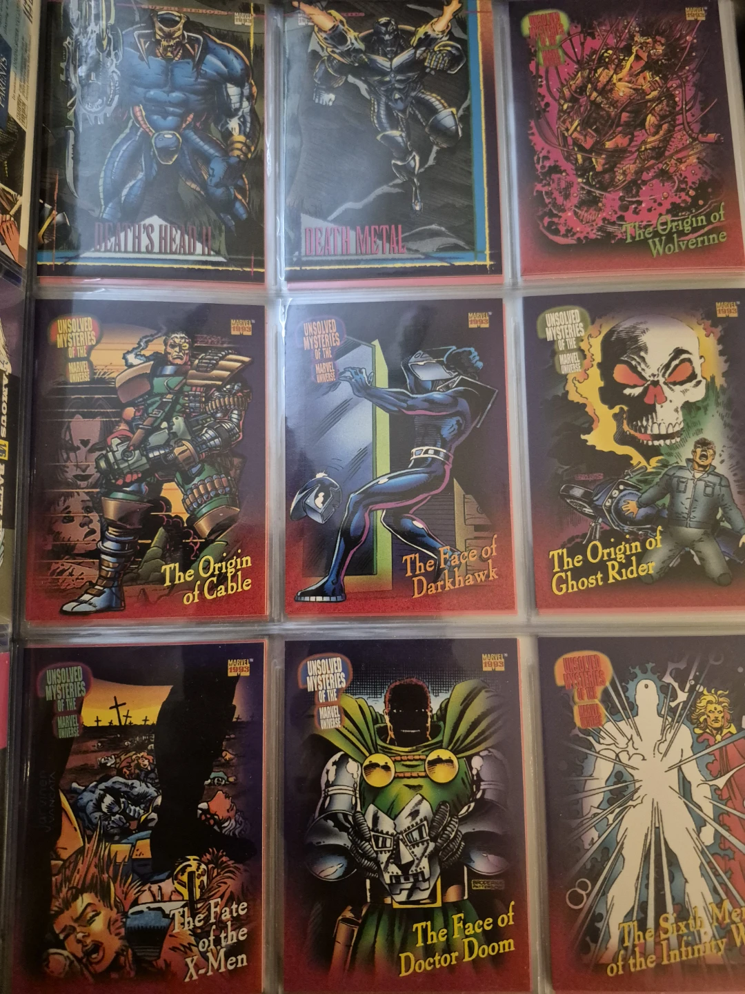 Collection of Marvel Universe trading cards featuring various characters. Cards include 'The Origin of Wolverine', 'The Face of Doctor Doom', and 'The Secret of Spider-Man's Parents'. These cards are from the Unsolved Mysteries and Famous Battles series.