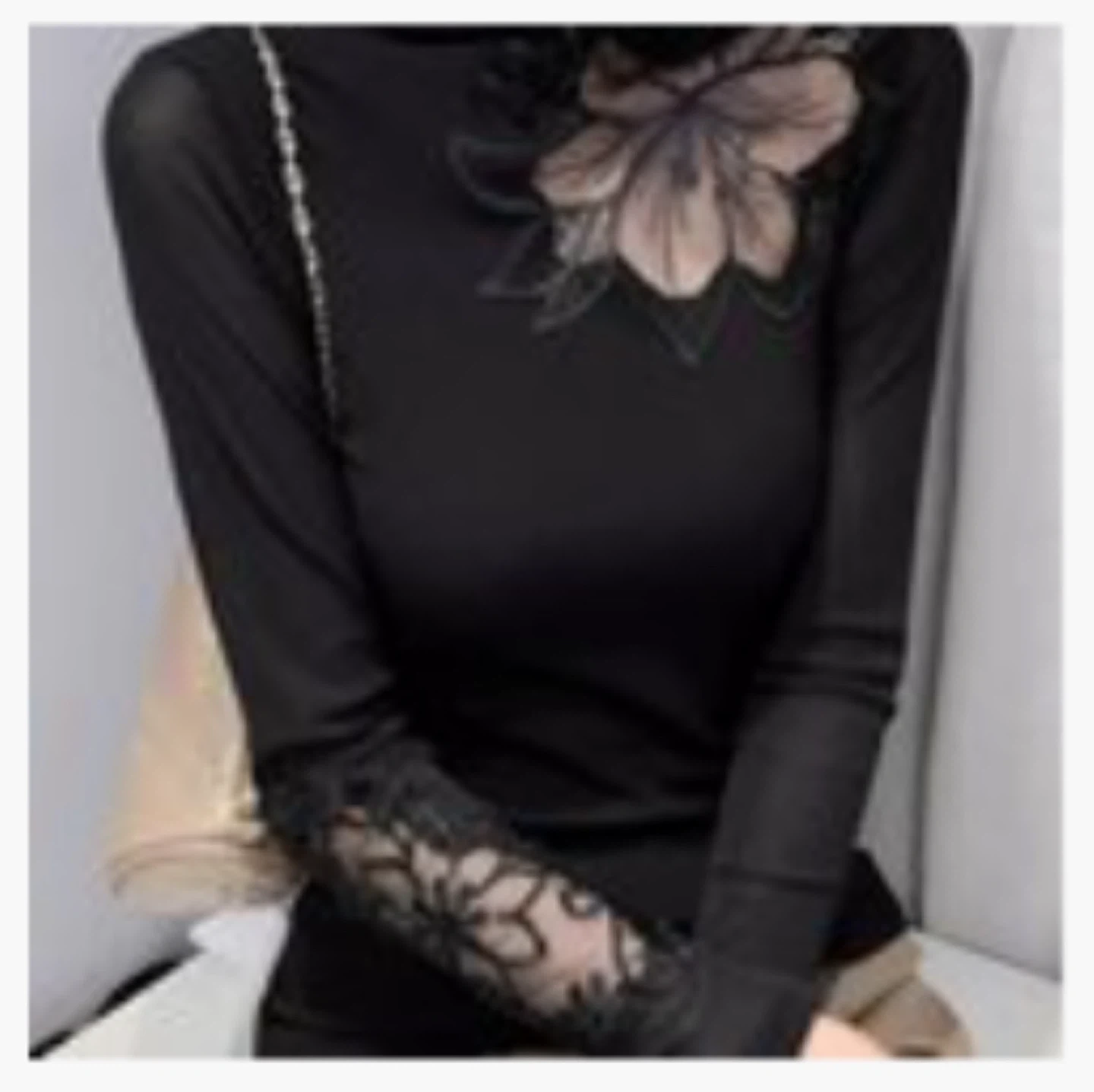 This is a black long sleeve top featuring a floral design on the front and lace detailing on the sleeves. It's a stylish piece that would look great dressed up or down!