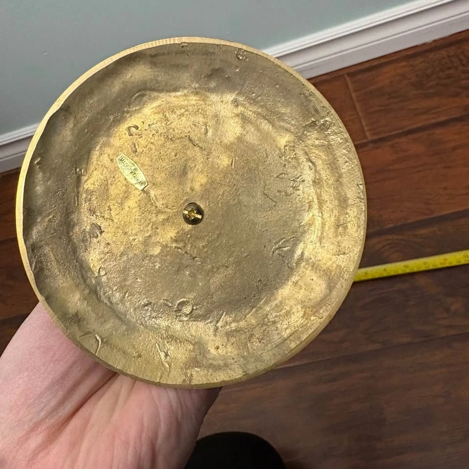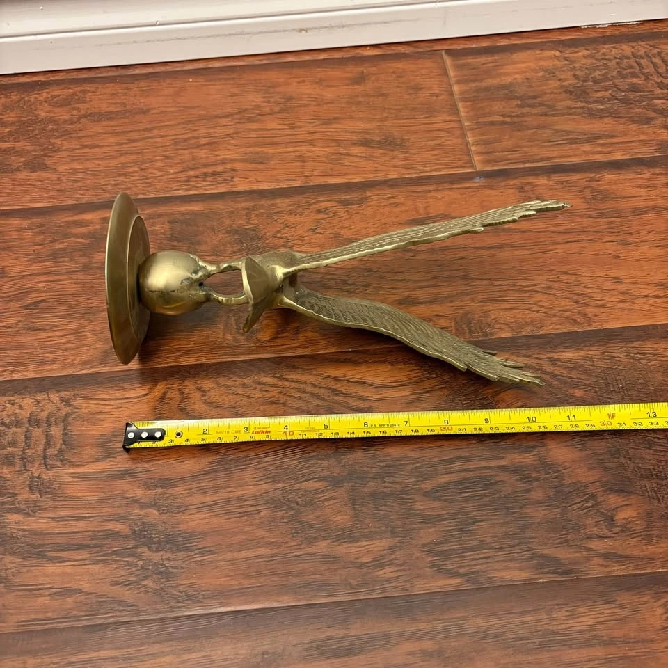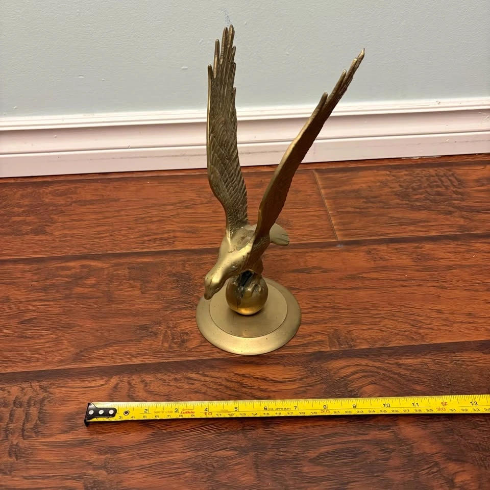 Solid brass eagle statue or figurine perched on a ball or sphere. Features a majestic eagle with wings spread wide, capturing a stance of authority. Primarily used as decorative home or office decor, or as a paperweight.