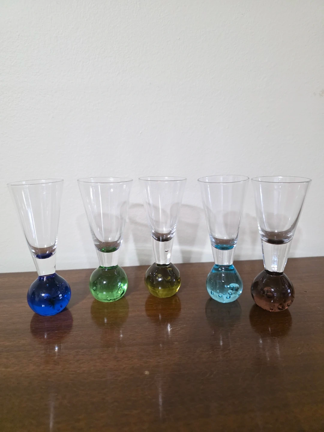 This set includes five shot glasses, each featuring a clear glass upper and a colorful, bubbled glass base. The bases come in blue, green, yellow, aqua, and brown. These glasses are perfect for serving individual shots or as a unique addition to your barware collection. They're sure to add a pop of color to any gathering!