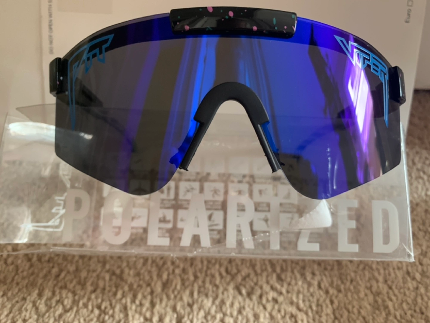 Pit Viper The Double Wide sunglasses. Blue mirrored lenses. Black frames with a colourful splatter design on the top. New in box.