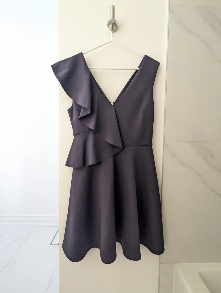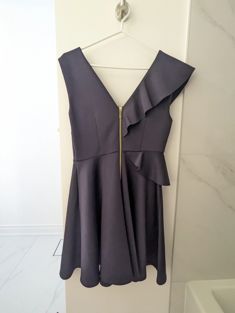 beautiful sleeveless navy blue dress with ruffle detail on one shoulder. The dress has a V neckline and a back zipper closure. scuba type material, flattering. great for weddings or special events. size 3, great condition. never worn, zipper protector still on. please note cash only, meeting at Union station weekdays or 298 John St Thornhill on weekends. thank you