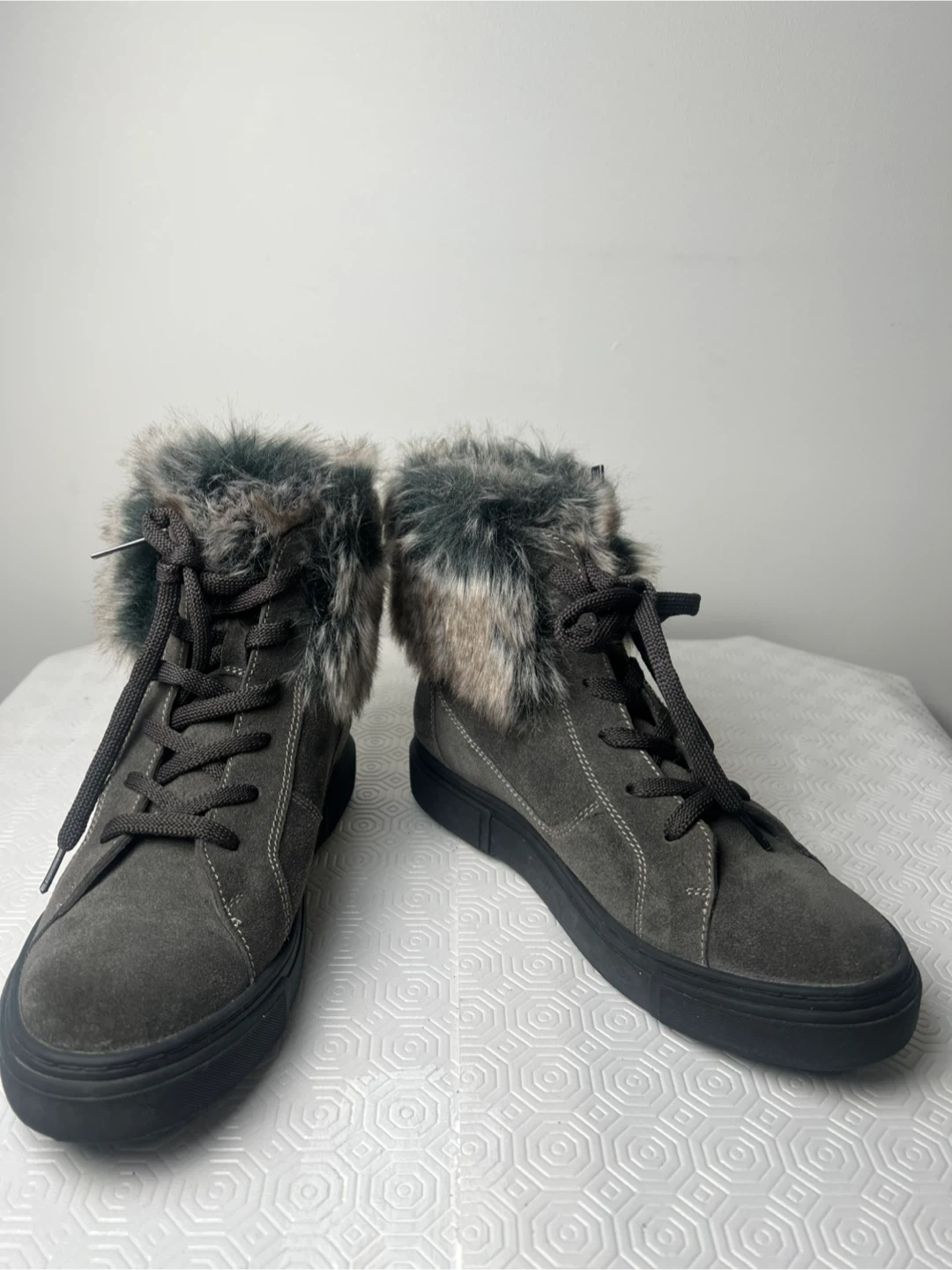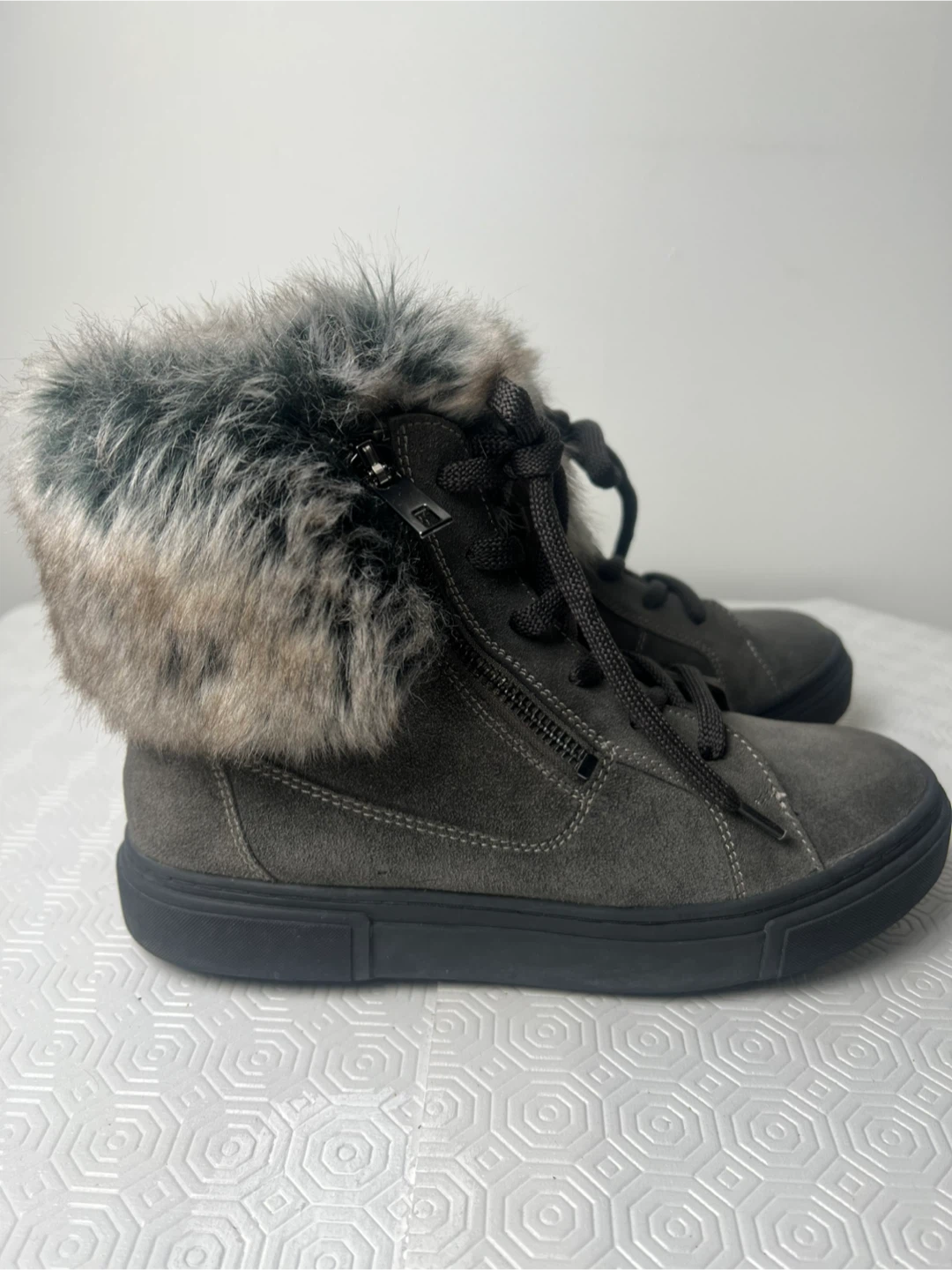 Stylish grey suede high top sneakers with a cozy faux fur trim. They feature lace-up closures and a convenient side zipper. The rubber soles provide good grip. Perfect for keeping your feet warm and fashionable during cooler weather!