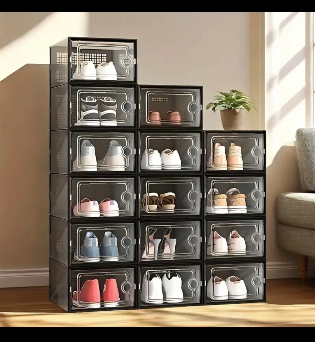 Selling 12 new Clear plastic shoe storage boxes,