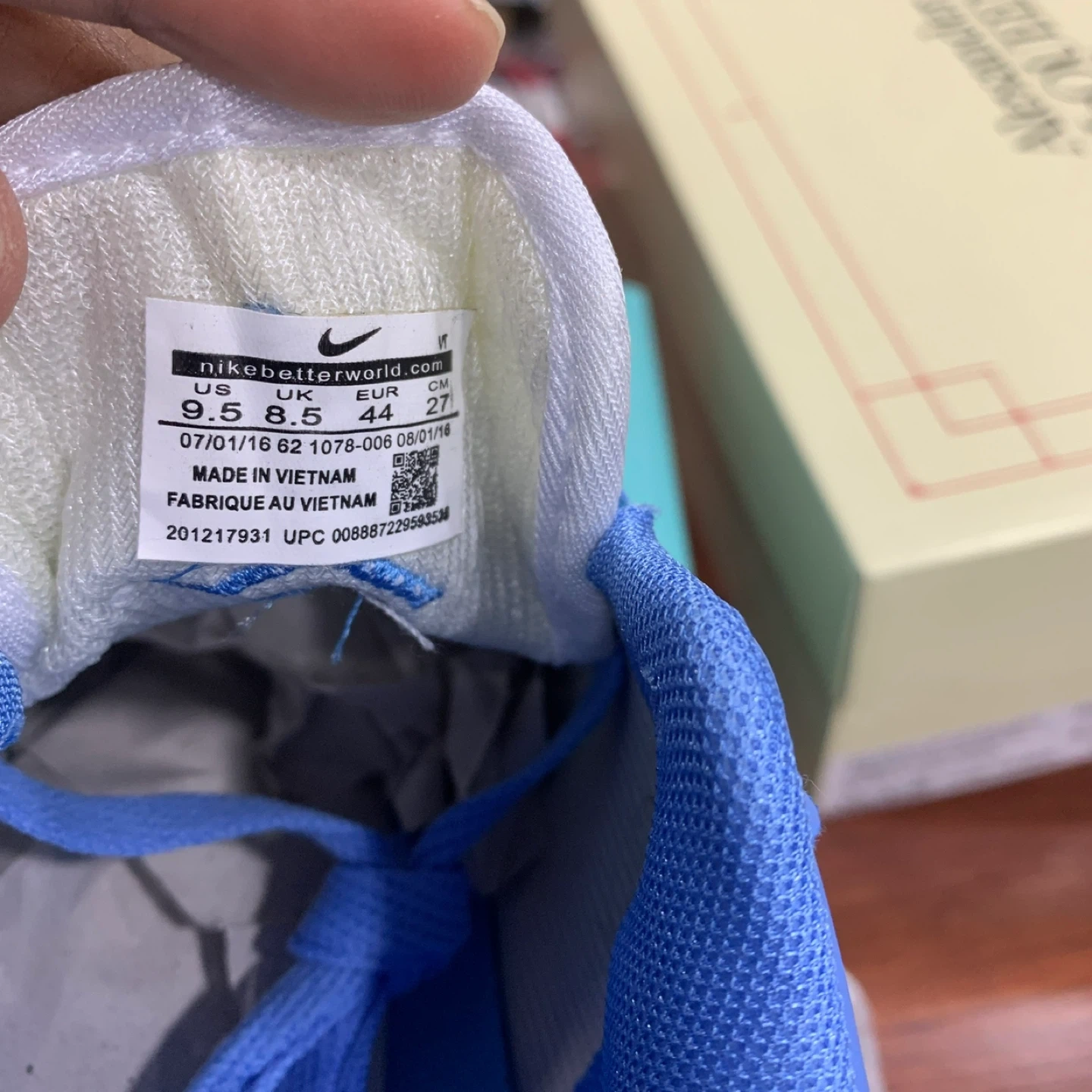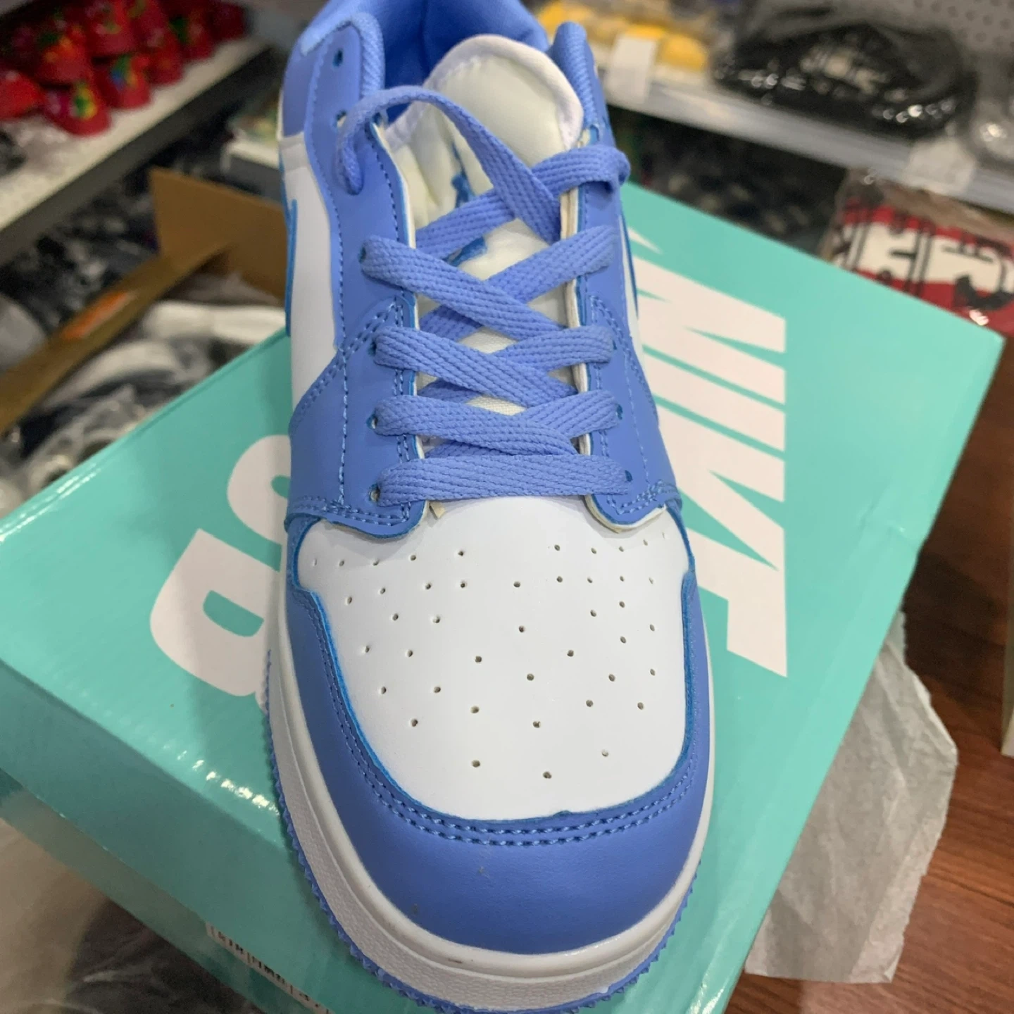 These Nike Air Jordan 1 Low SE sneakers come in a classic white and university blue colorway. They feature a leather construction with perforations on the toe box and a rubber outsole. Includes the original box. Size is 9.5.