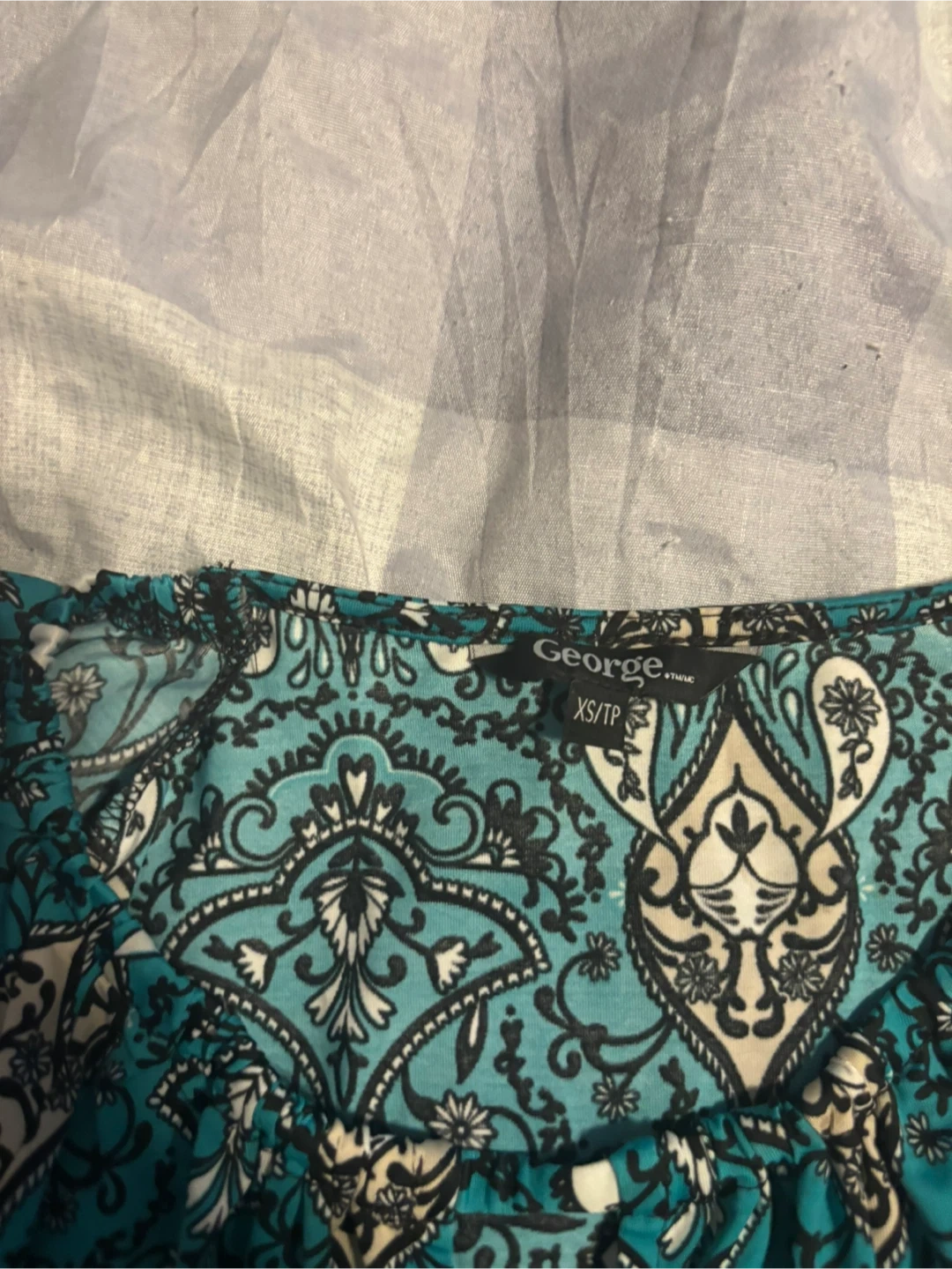 It's a women's dress from George. It's size XS/TP with a teal, black, and cream paisley pattern. Sleeveless with a tie waist.