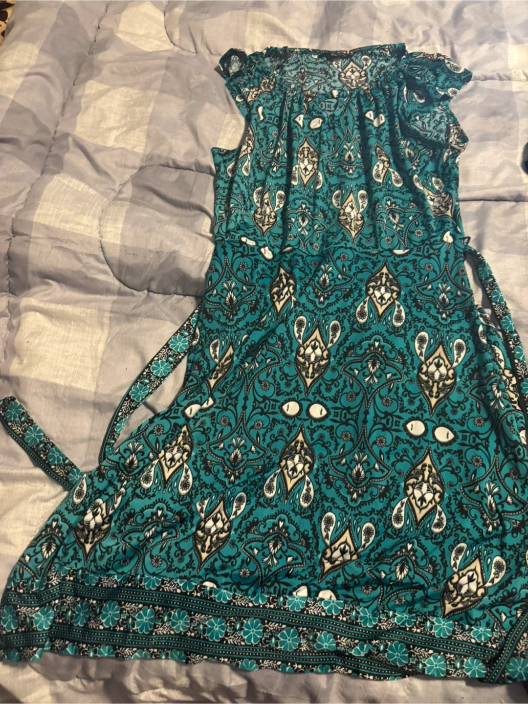 It's a women's dress from George. It's size XS/TP with a teal, black, and cream paisley pattern. Sleeveless with a tie waist.