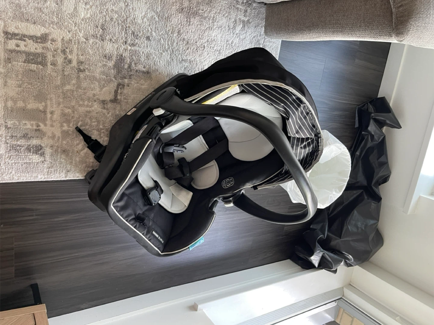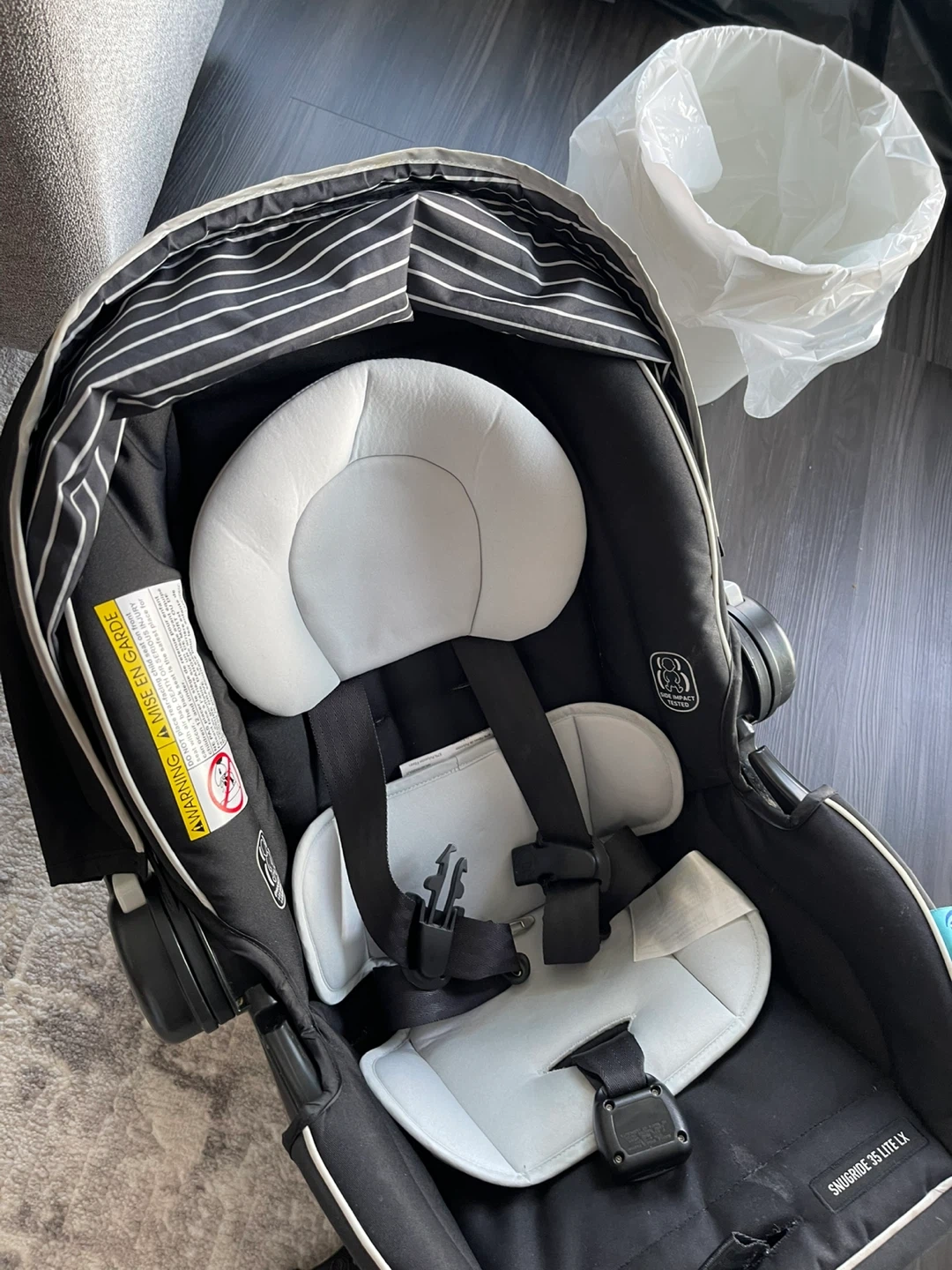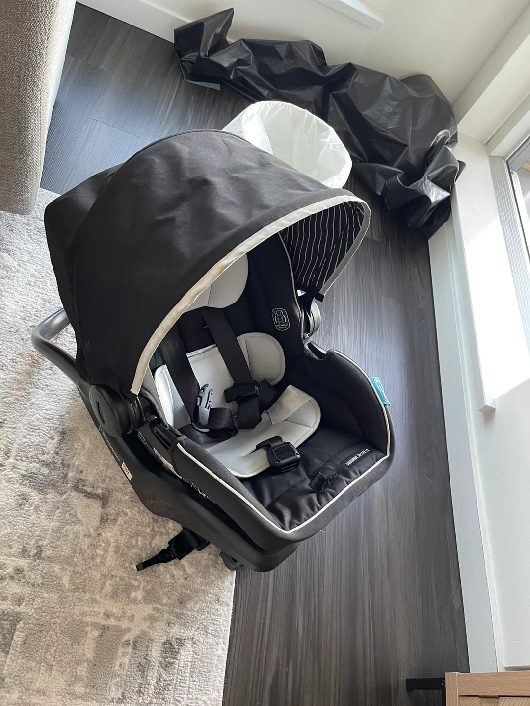 This is a Baby Trend SnugRide 35 Lite LX infant car seat. It's black with white and gray accents. It includes a padded headrest and harness system.