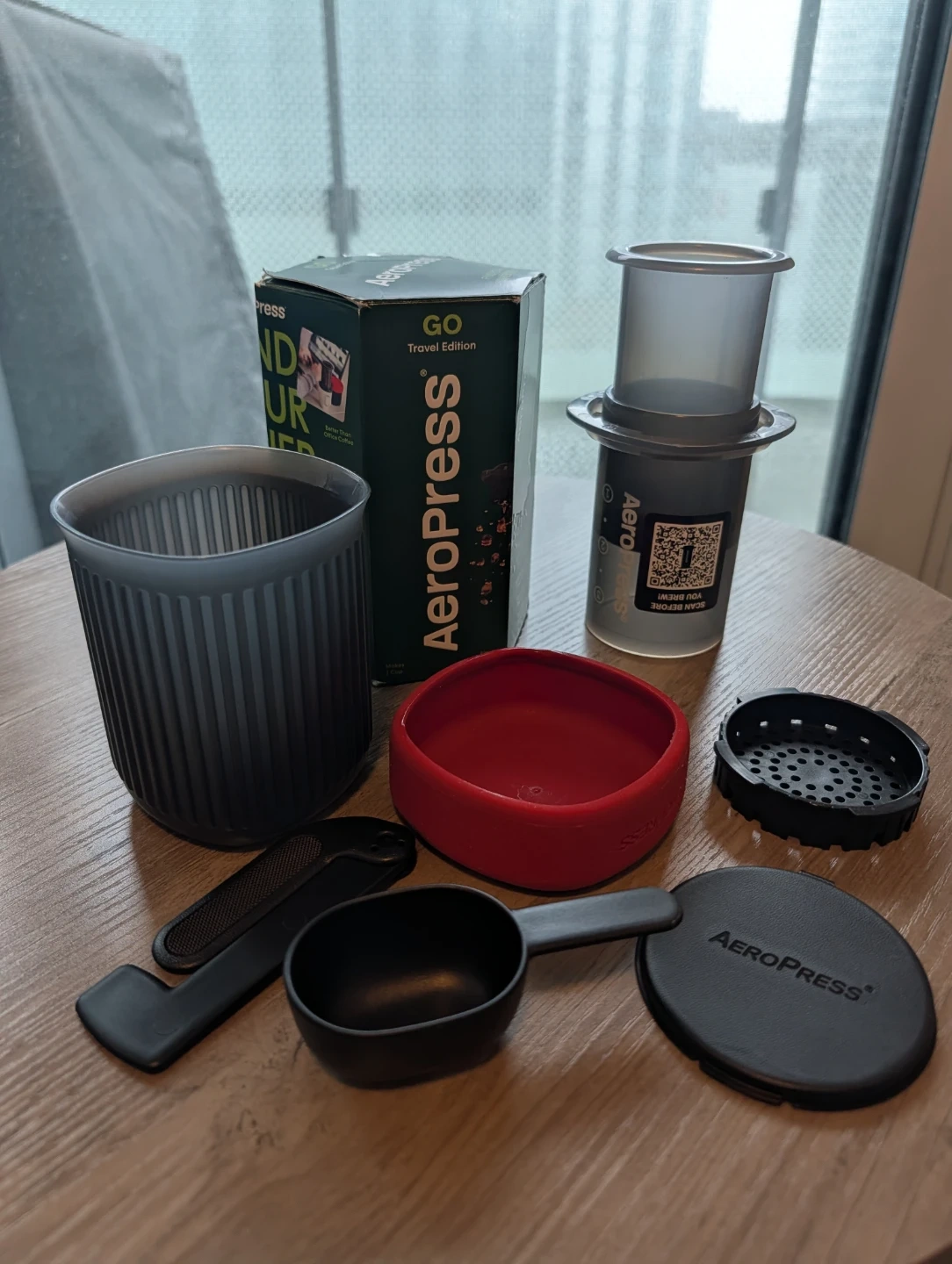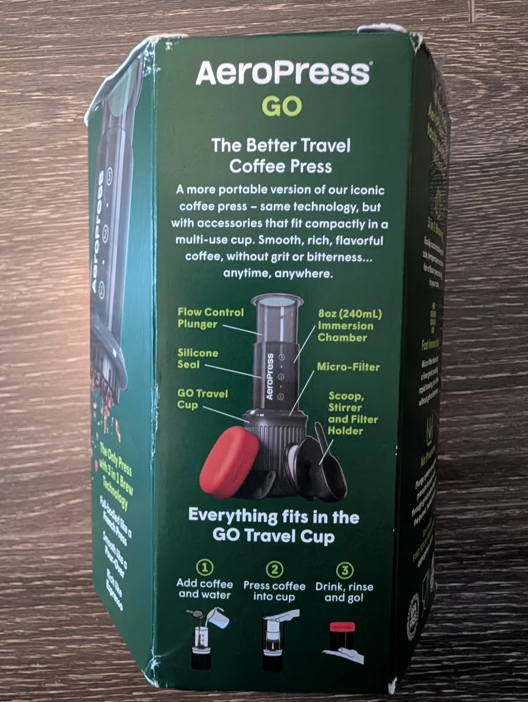 This is the AeroPress Go Travel Edition coffee press. It's a portable version of their iconic coffee maker. Includes the GO travel cup, scoop, stirrer, and filter holder. * Not include filter paper *