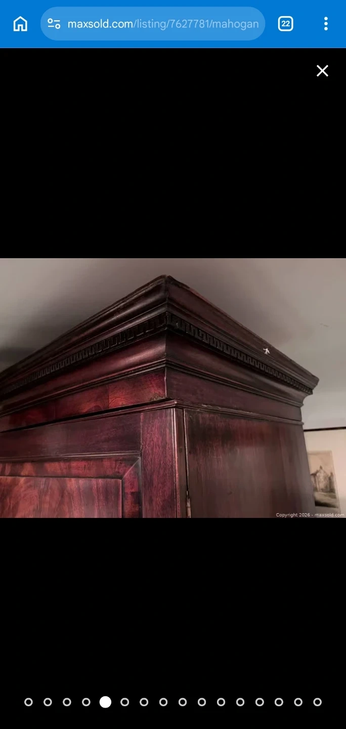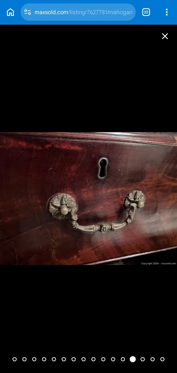 A beautiful antique mahogany chest of drawers with two cabinet doors on top. It features ornate brass hardware and a rich, deep wood grain. This piece offers ample storage with multiple drawers and cabinet space. It's perfect for a bedroom or living room needing a touch of vintage charm and substantial storage.