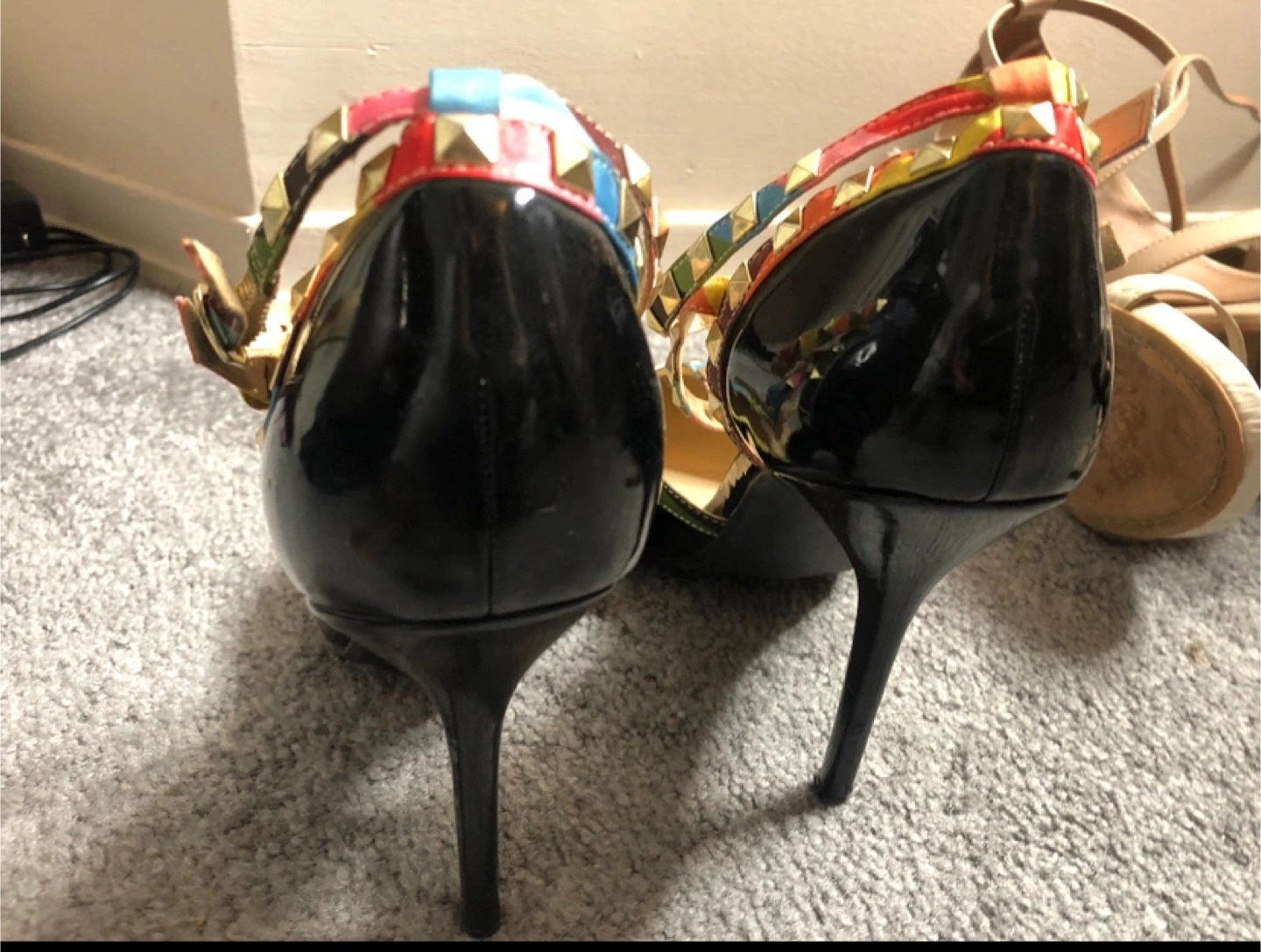 These Diba heels are a real statement piece! They feature a sleek black patent finish and a vibrant, colourful studded design. The size is a women's 10. They're in good condition and ready for a night out!