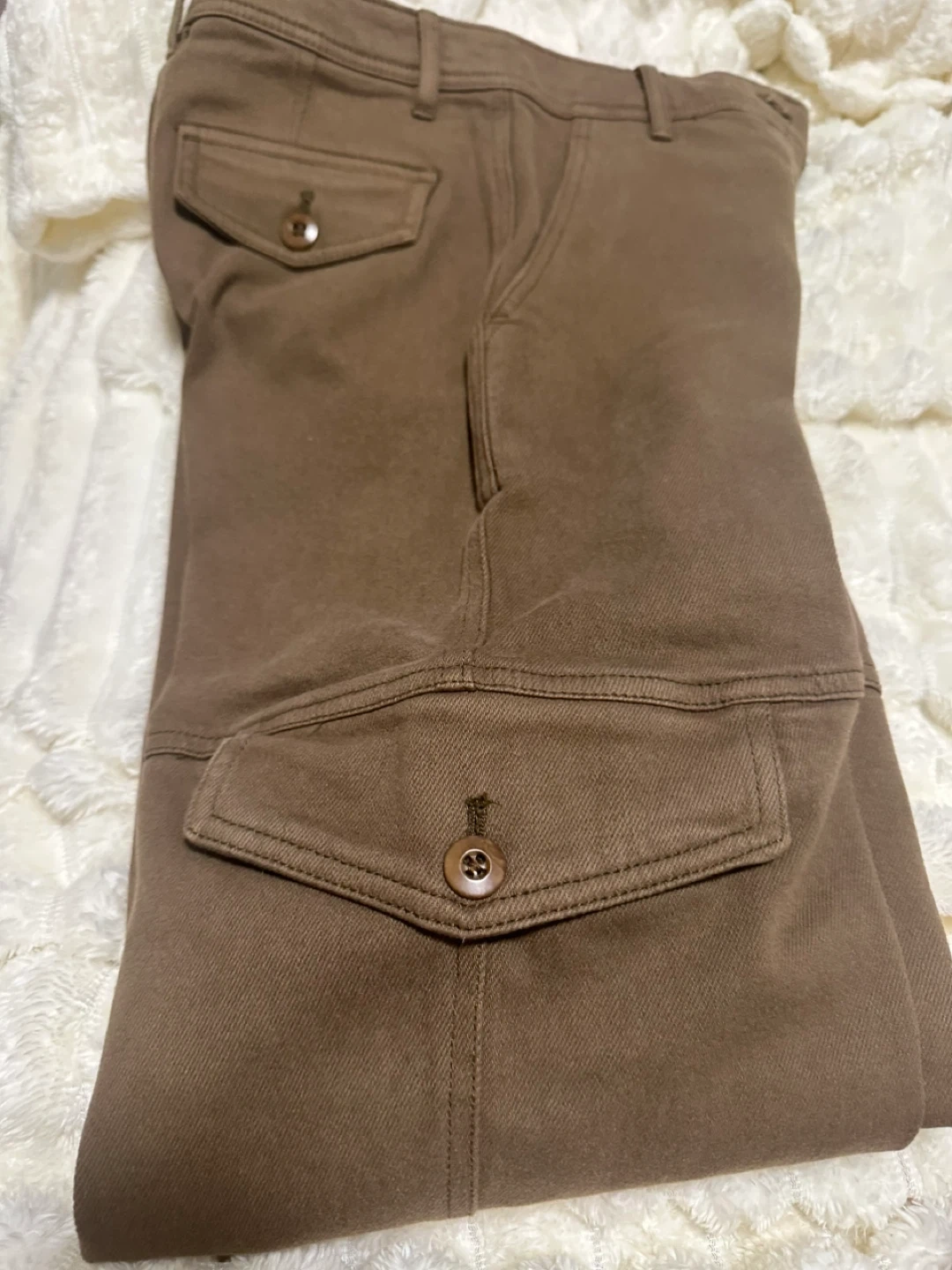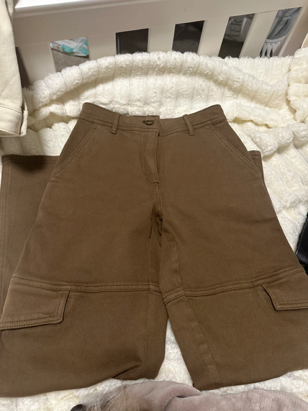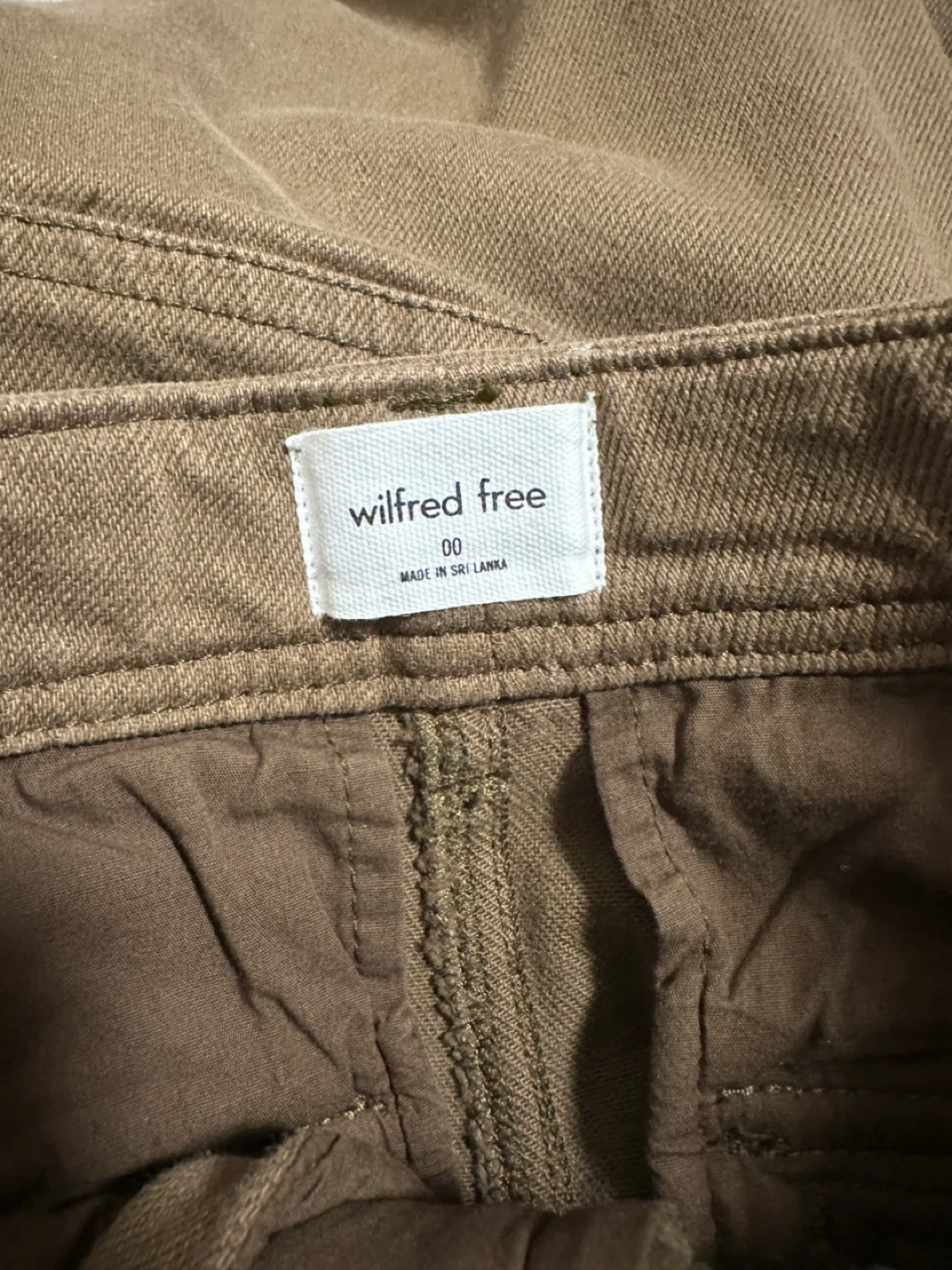 These Wilfred Free cargo pants are a rich brown colour. They're a size 00 and made in Sri Lanka. They feature button closures on the cargo pockets.