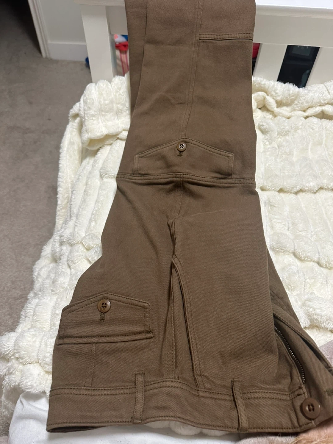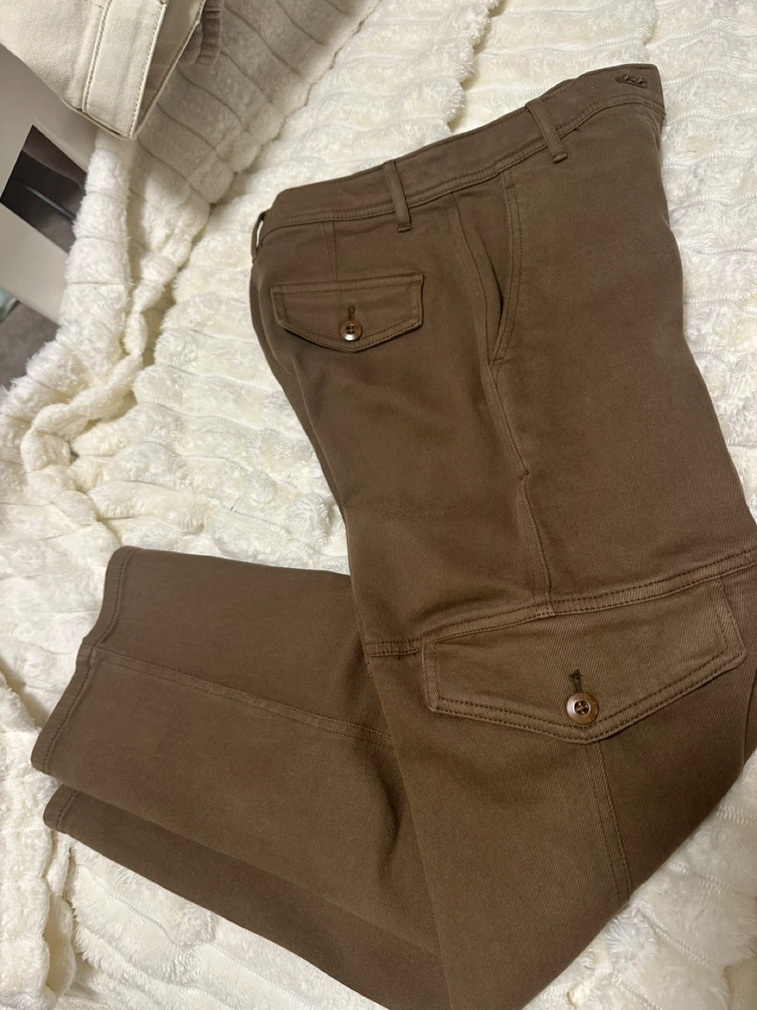 These Wilfred Free cargo pants are a rich brown colour. They're a size 00 and made in Sri Lanka. They feature button closures on the cargo pockets.