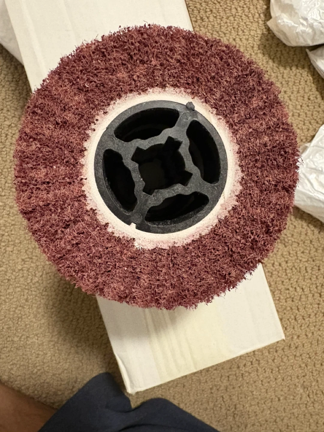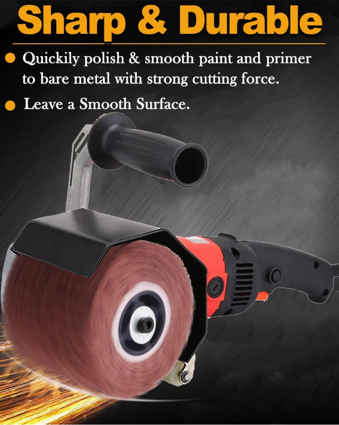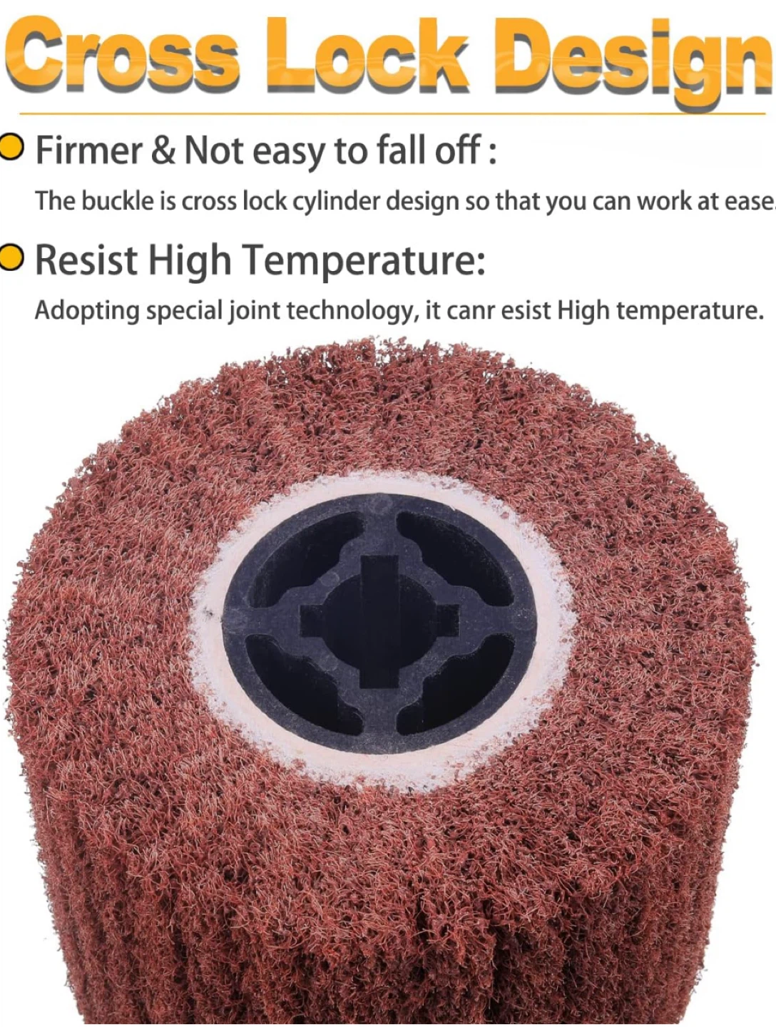 This is a grinding polishing wheel head designed for removing rust, stone slab cleaning, wood polishing, grinding aluminum, weld polishing, and stain removal. It quickly takes off paint and rust without damaging the surface and leaves a smooth surface. The buckle has a cross lock cylinder design so that you can work at ease. It resists high temperature.