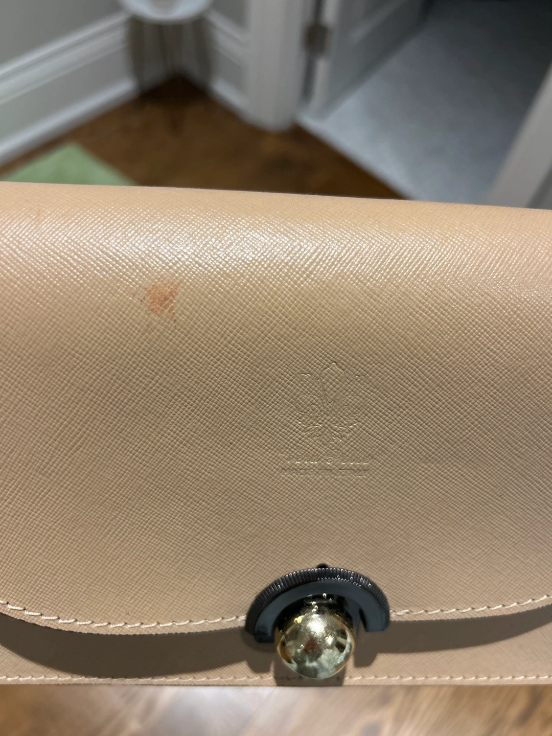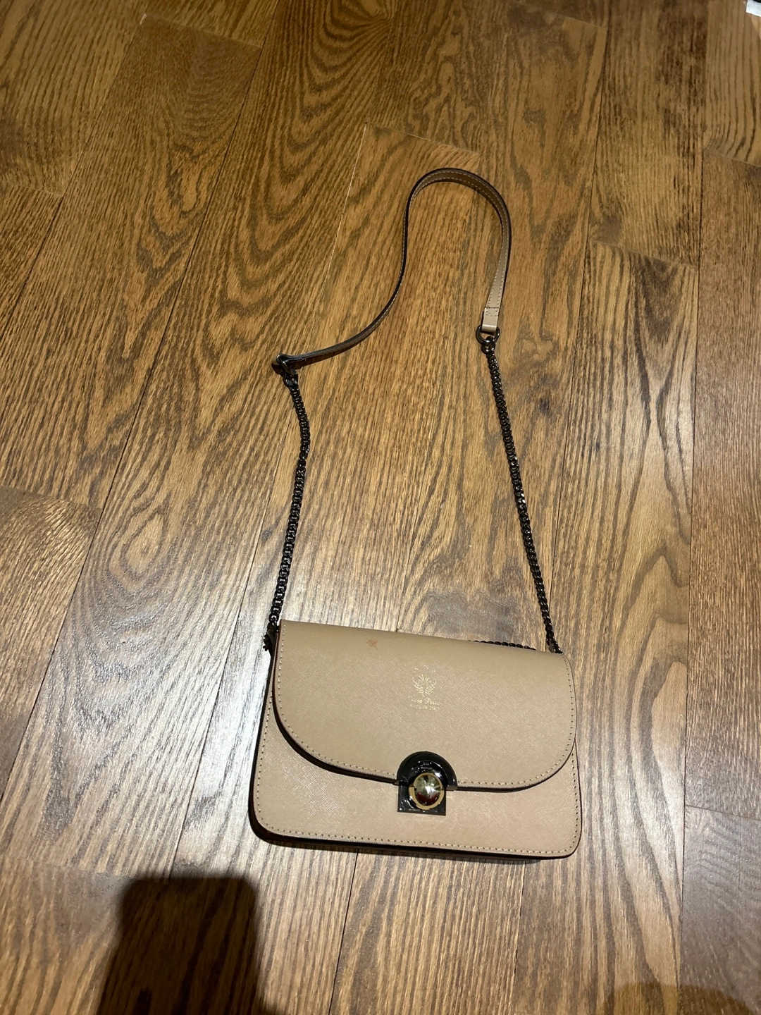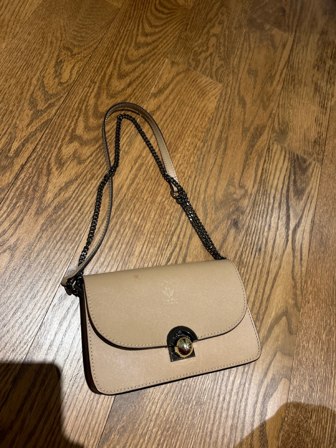 Small tan purse with a chain strap, can be shoulder bag or cross body. Has a gold clasp. Small red stain on the front.