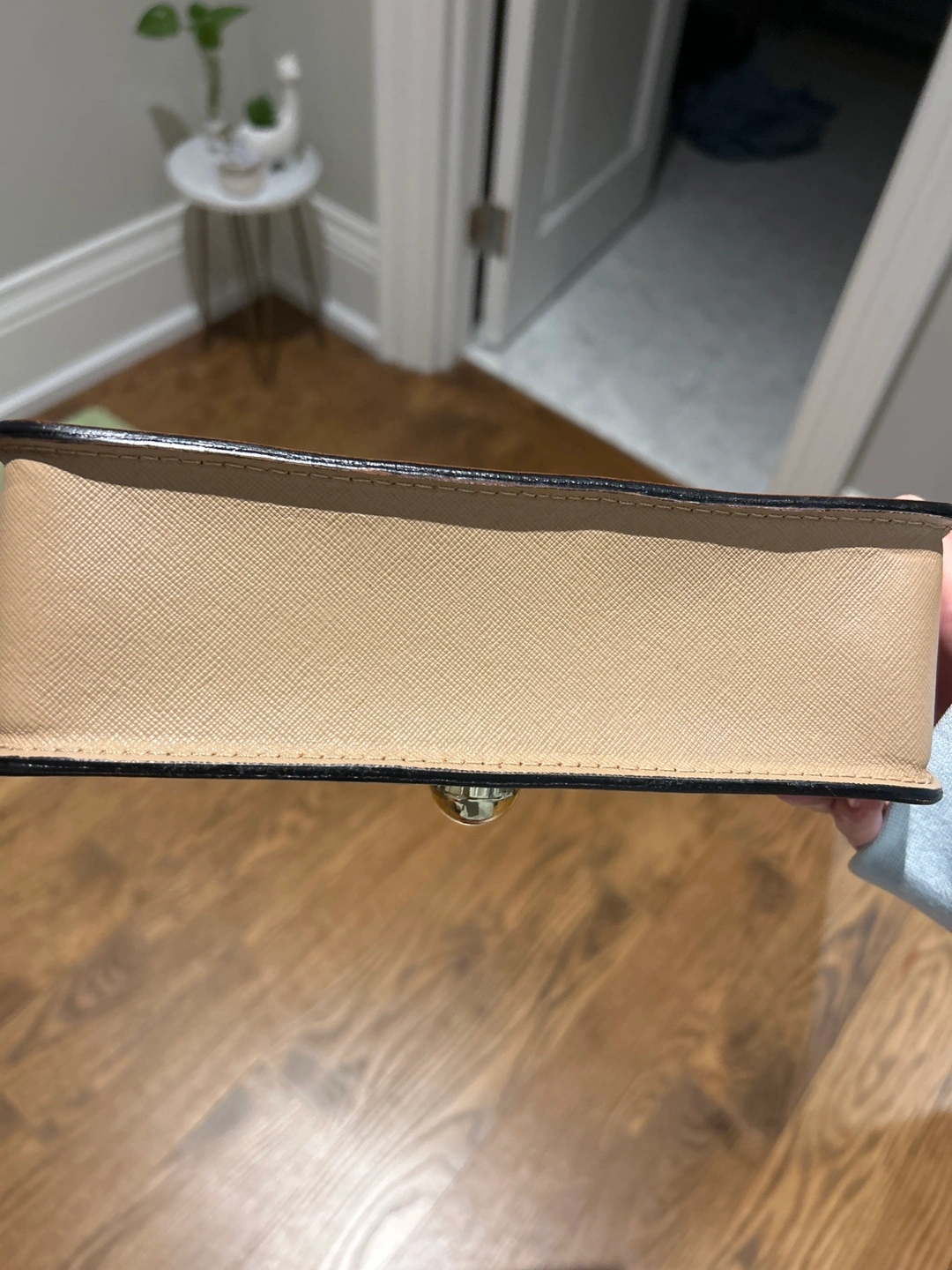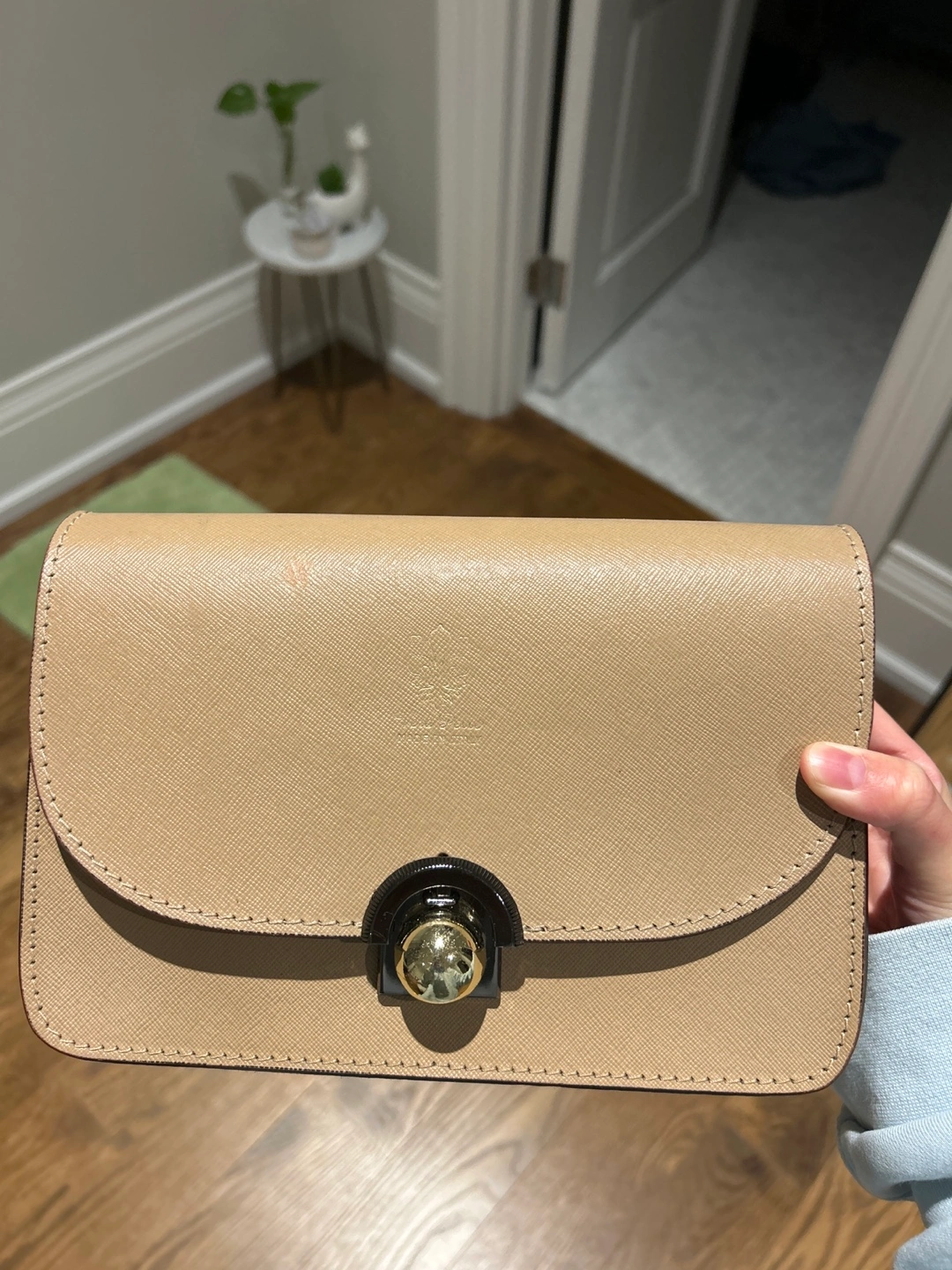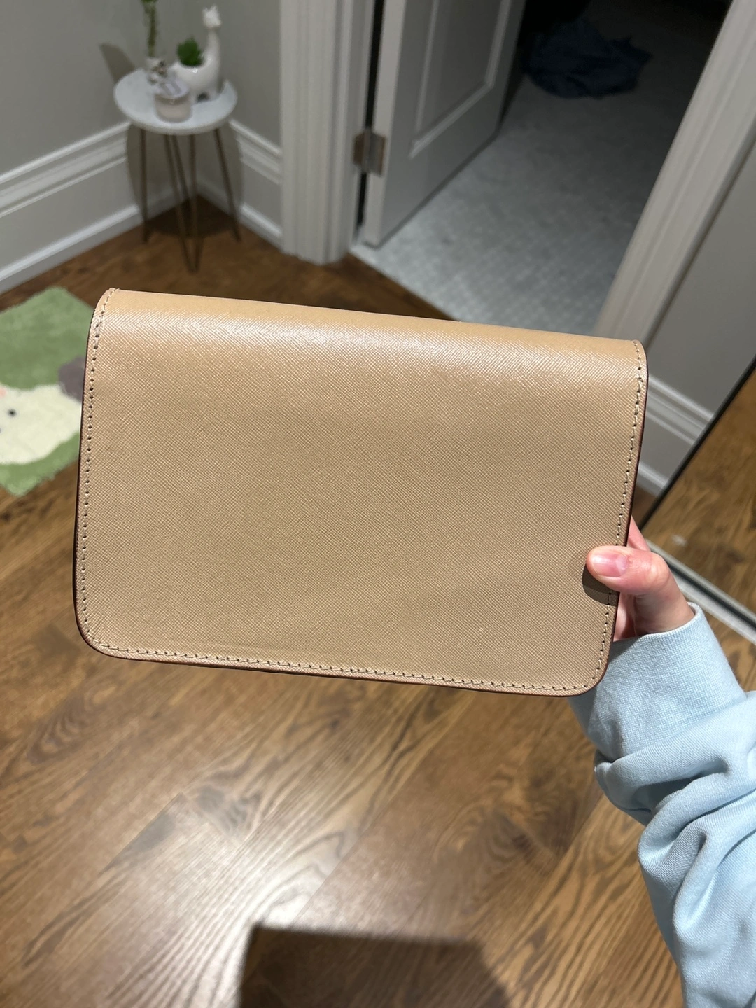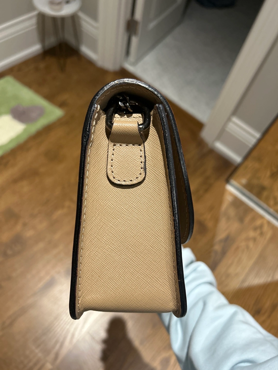 Small tan purse with a chain strap, can be shoulder bag or cross body. Has a gold clasp. Small red stain on the front.