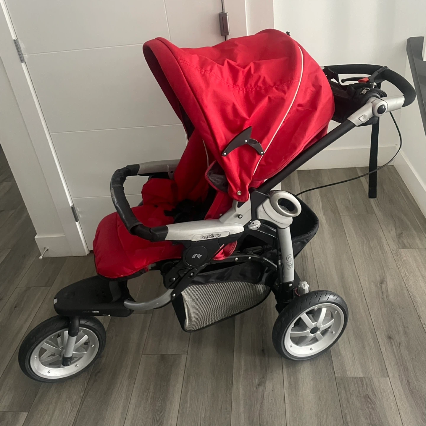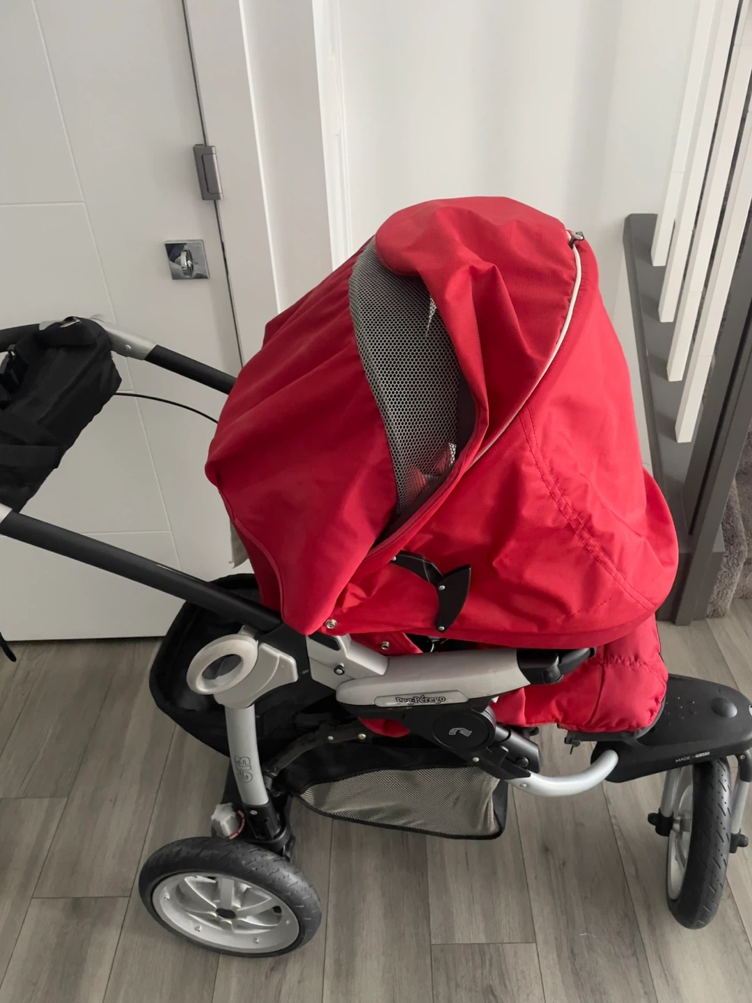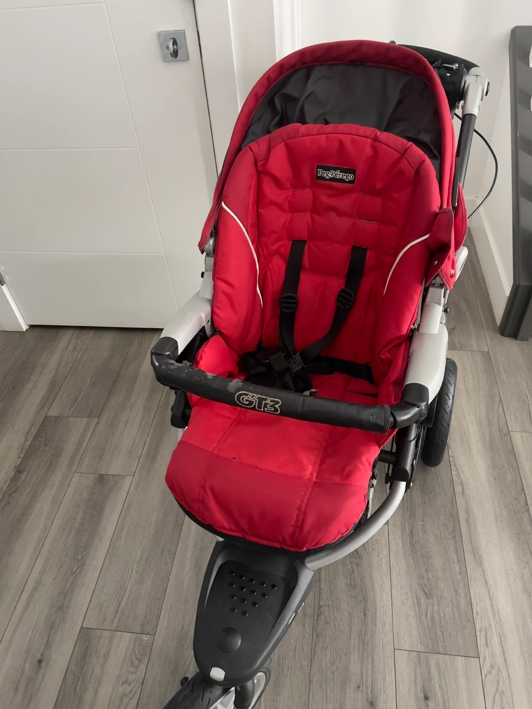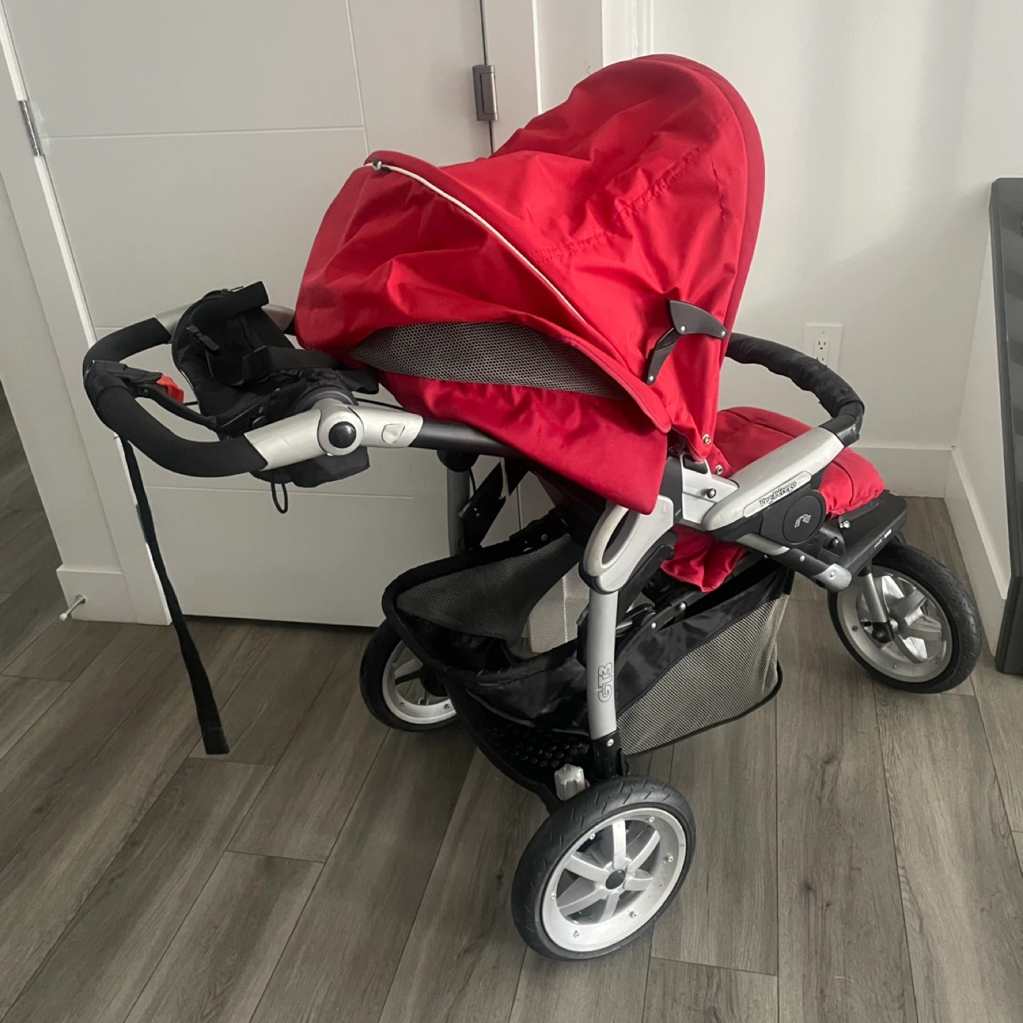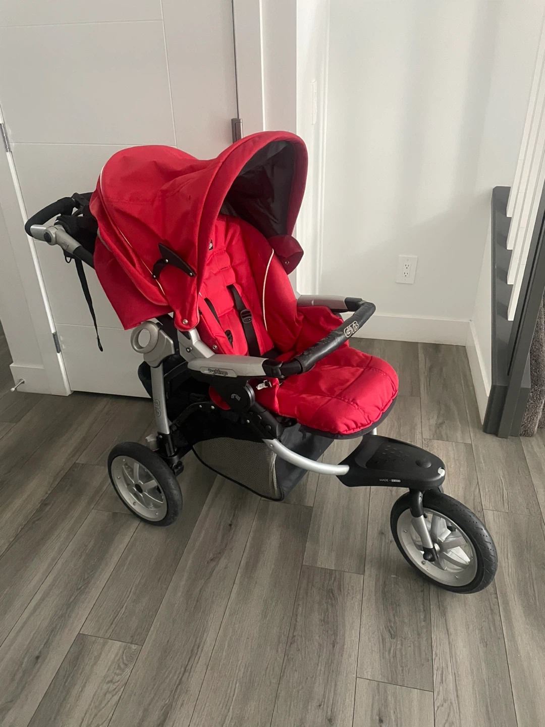 Peg Perego GT3 Stroller. It’s A Three Wheeled Jogging Stroller. Includes A Red Liner And A Clear Rain Cover. It’s In Good Condition.