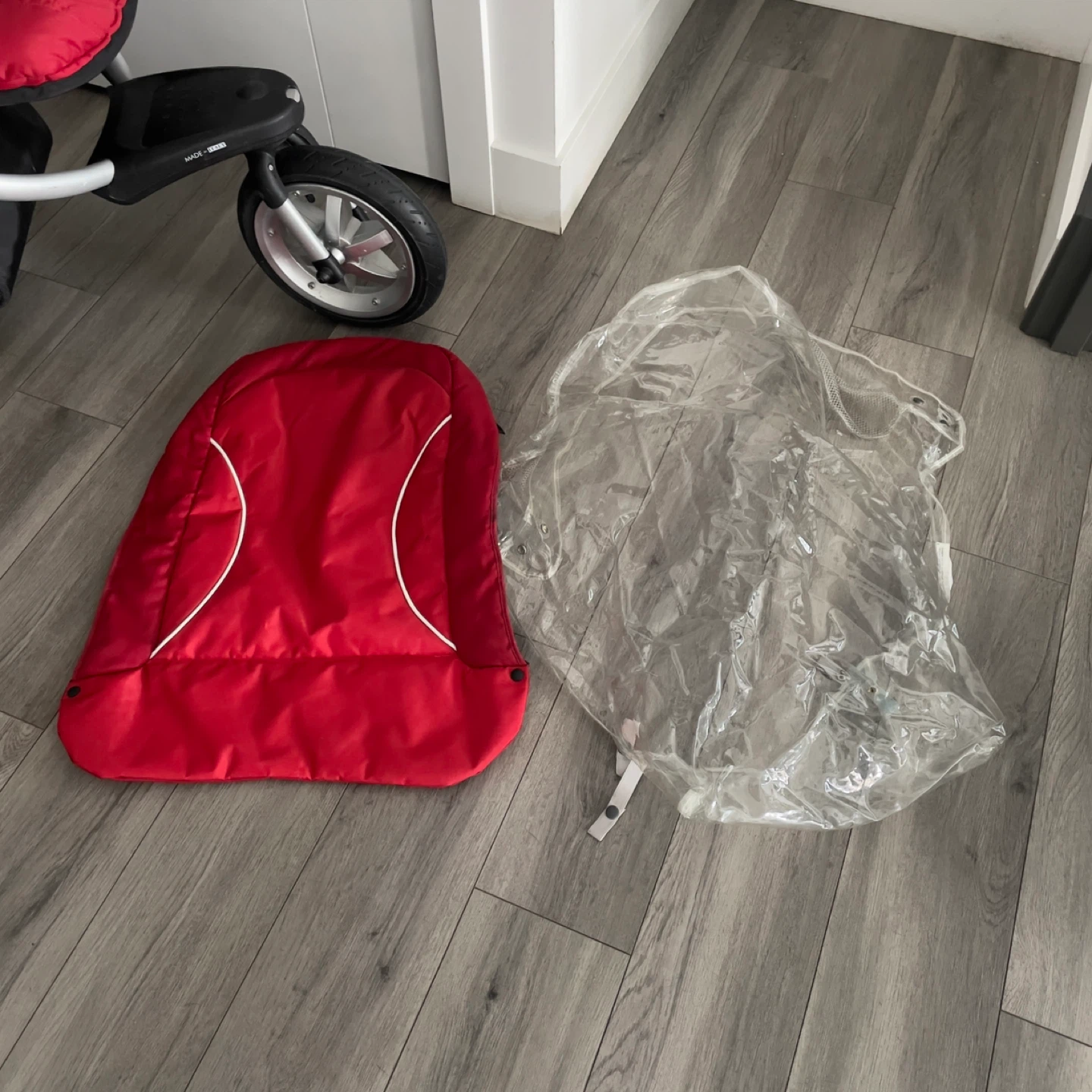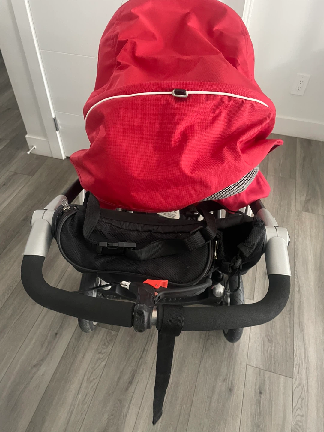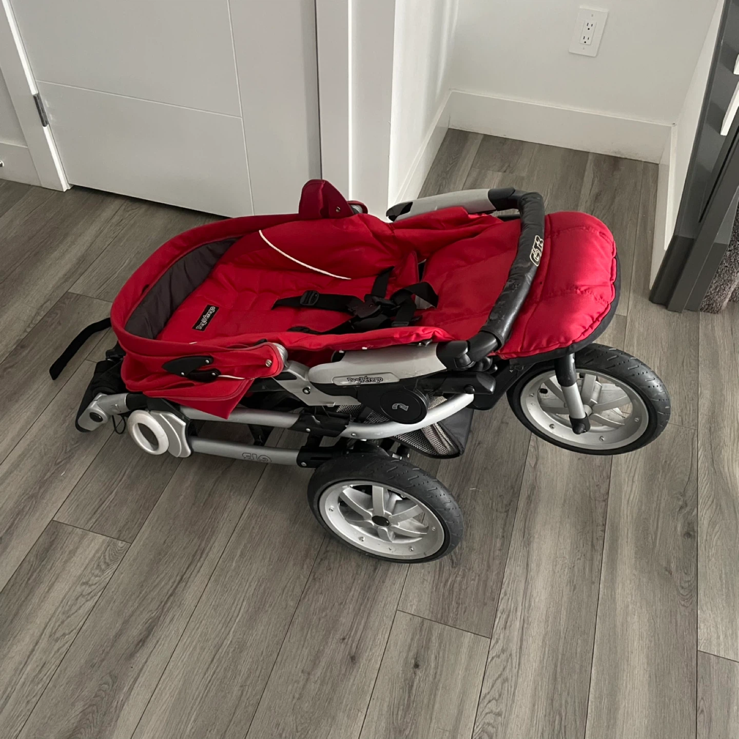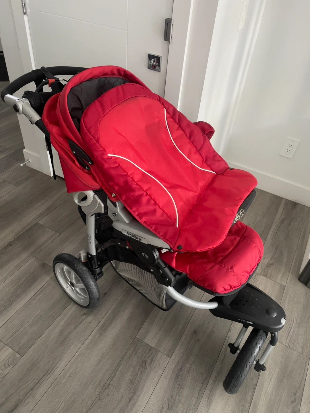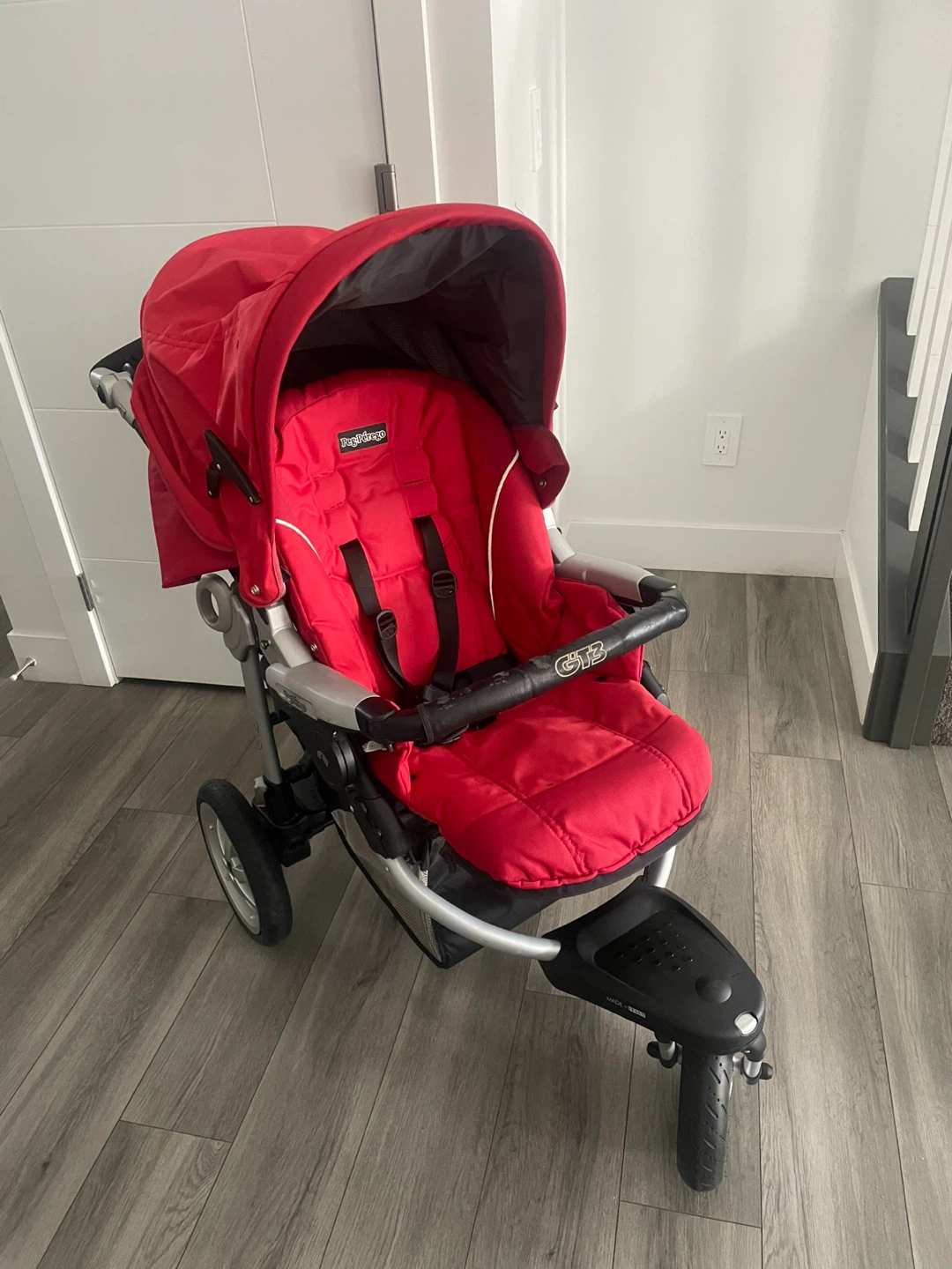 Peg Perego GT3 Stroller. It’s A Three Wheeled Jogging Stroller. Includes A Red Liner And A Clear Rain Cover. It’s In Good Condition.