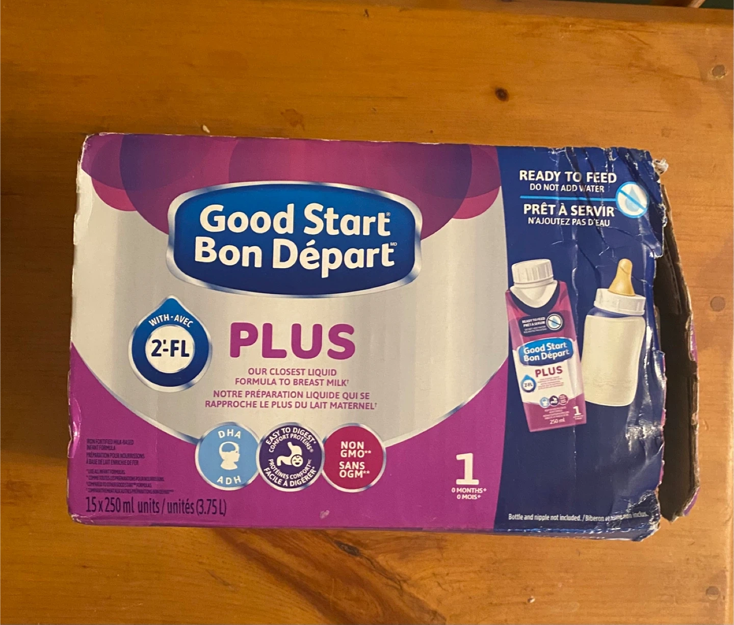 Ready to feed liquid formula from Good Start Bon Départ Plus. This formula is for 0-9 months. It comes in 15 units of 250 ml each. Expiry date is 2026 September.