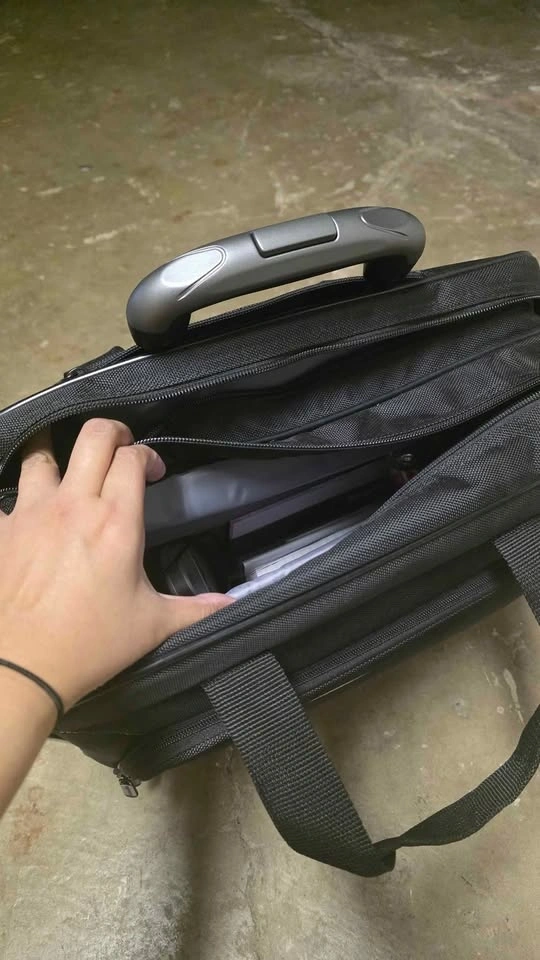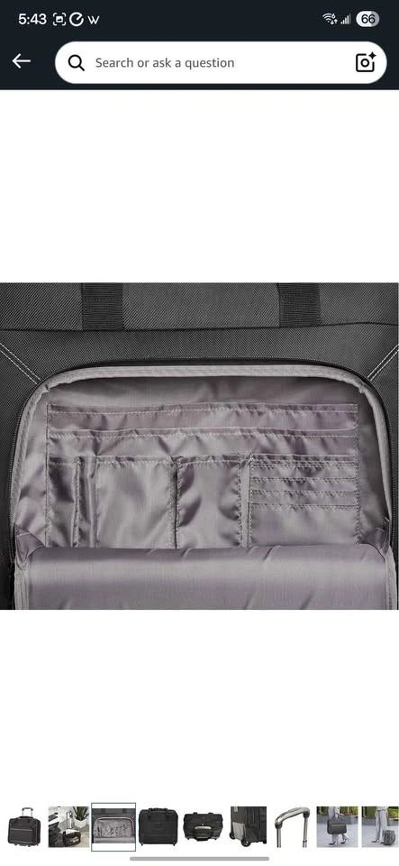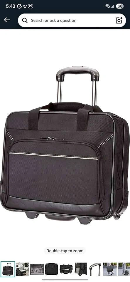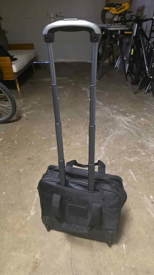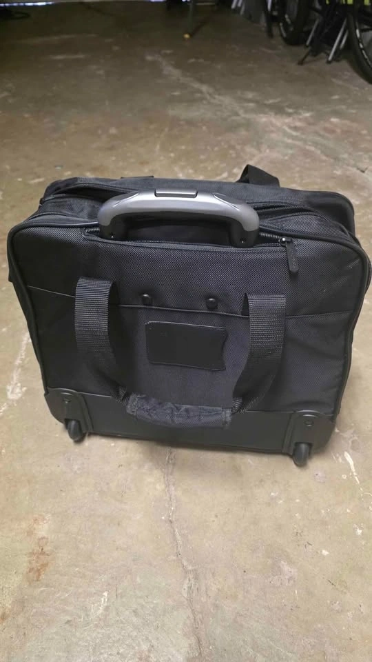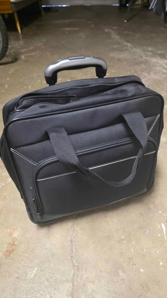 Used twice. No scratches or stains. Rolling laptop case designed for on-the-go professionals. Easy-access front pocket with compartments for smaller items like pens, notepads, and business cards. Designed to protect laptops with up to 15.6 inch screens. Lightweight yet sturdy design. Fits under airplane seats. Adjustable push-button locking handle with quick-rolling wheels.