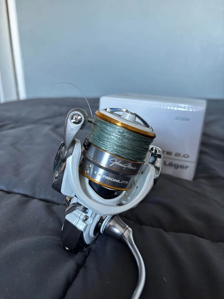 Johnny Morris CarbonLite 2.0 spinning reel in excellent condition. Smooth retrieve, reliable drag, and well cared for. Comes with the original box, extra spool, and extra drag cap. Very lightweight and balanced reel — great for bass, walleye, trout, and all-around freshwater fishing. The extra spool is perfect for running different line setups. Includes: Johnny Morris CarbonLite 2.0 Size 2000 spinning reel, extra spool, extra drag cap, original box. Fully functional, smooth operation. Line currently spooled (can remove if preferred). Pickup preferred.
