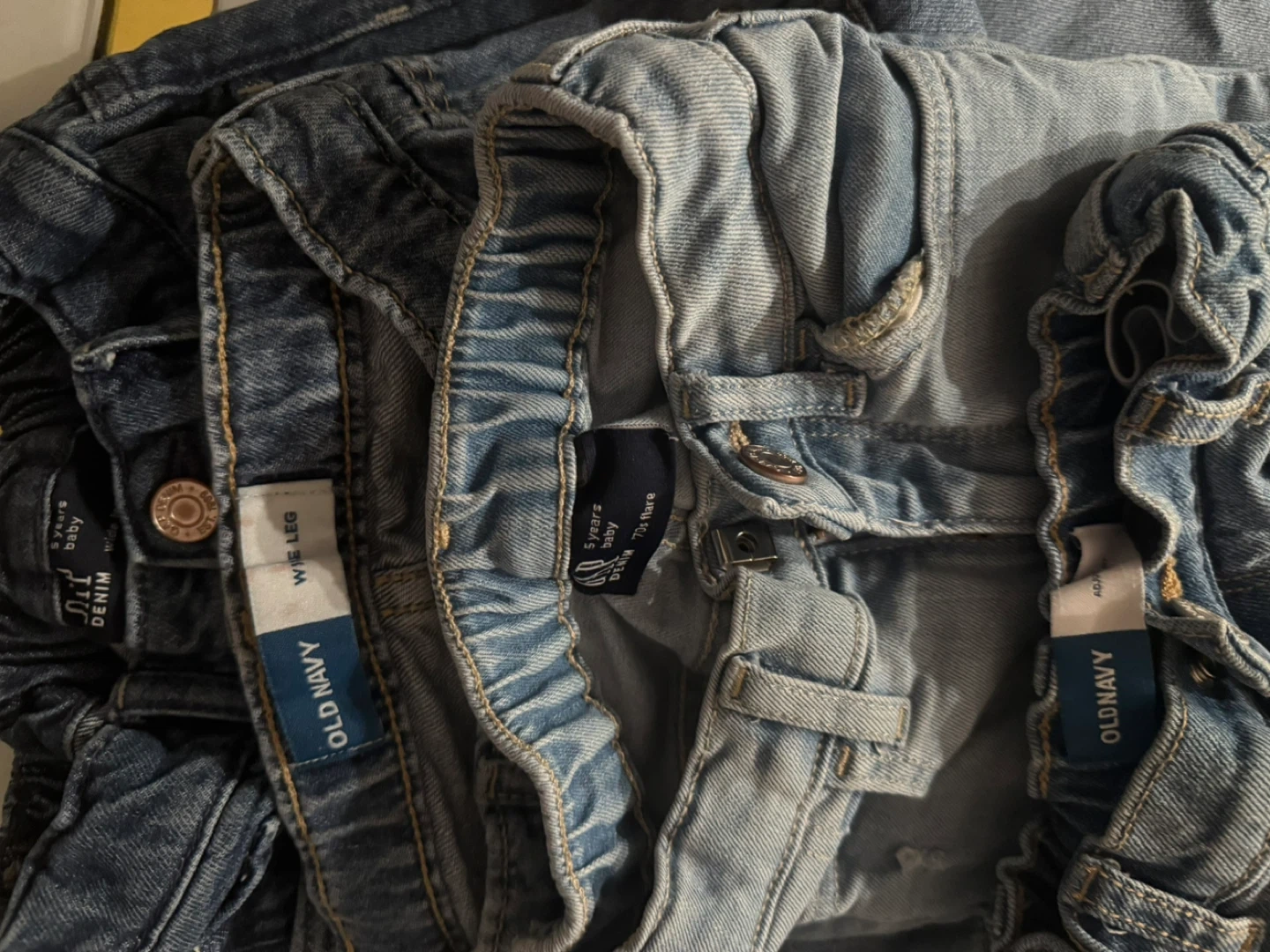 This bundle includes various girls' clothing items. Featured are denim jeans, ribbed tights in white and olive green, and a pink shirt. It's a great mix for everyday wear!