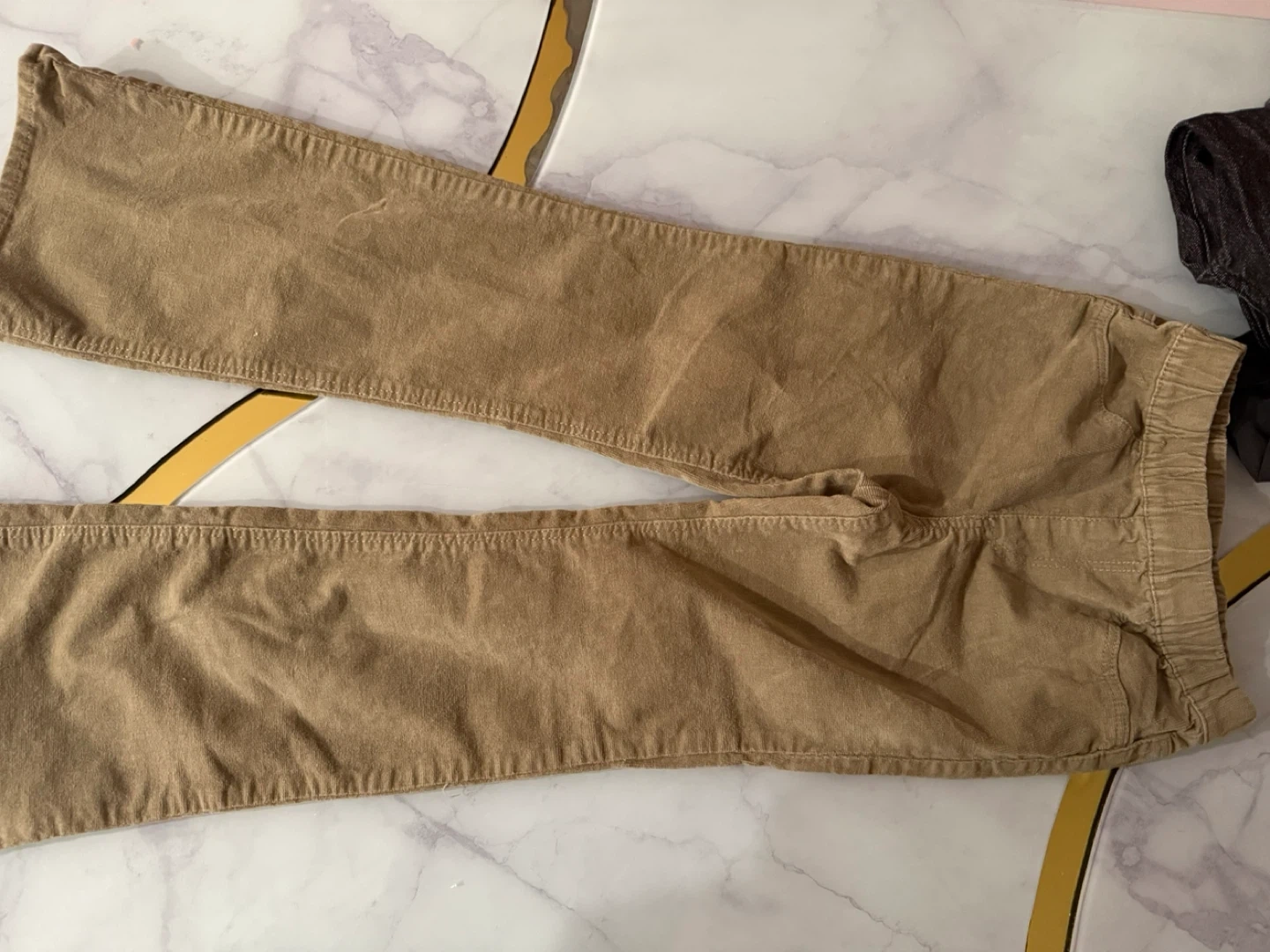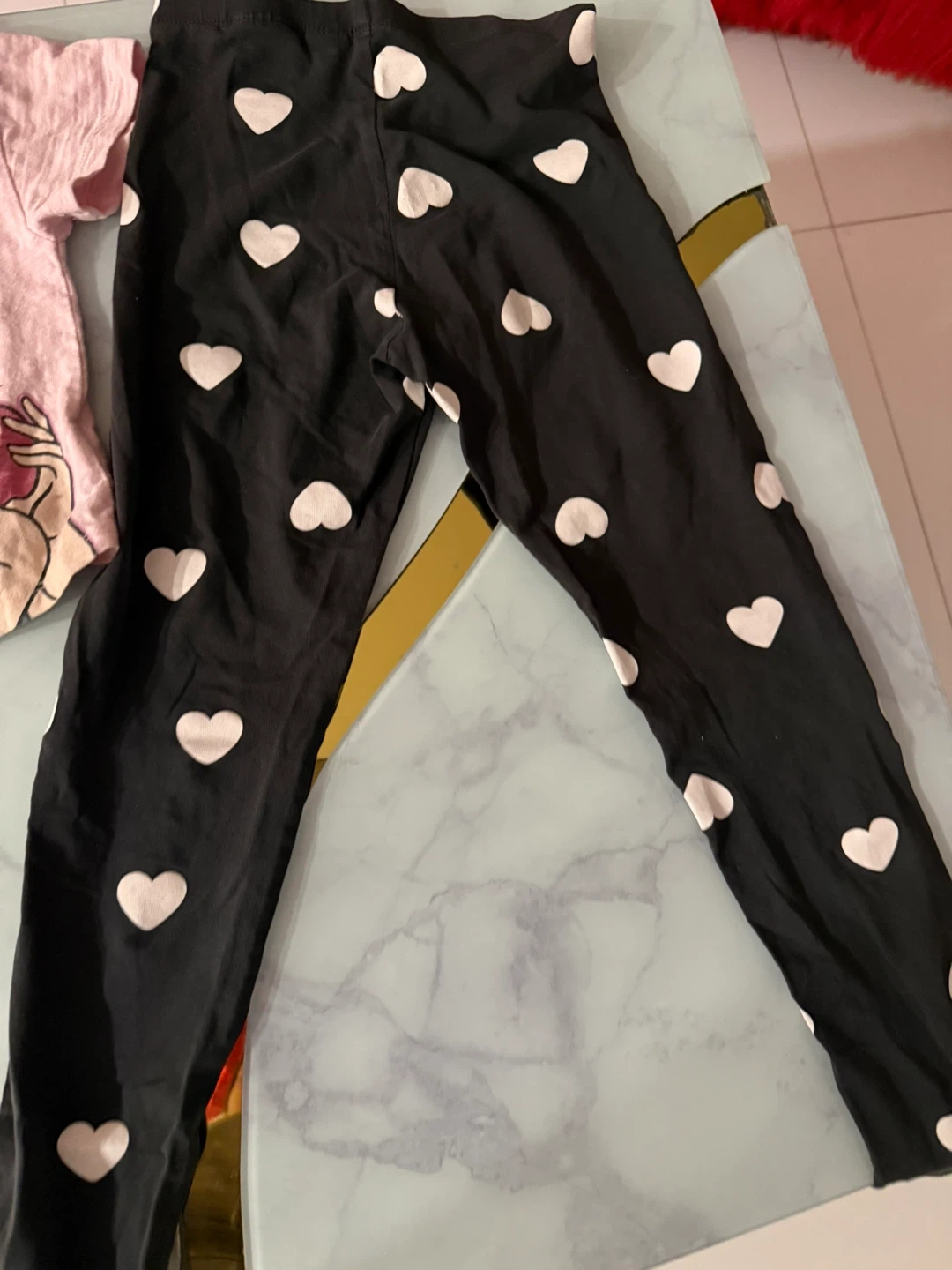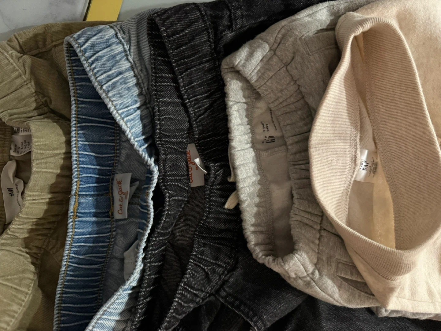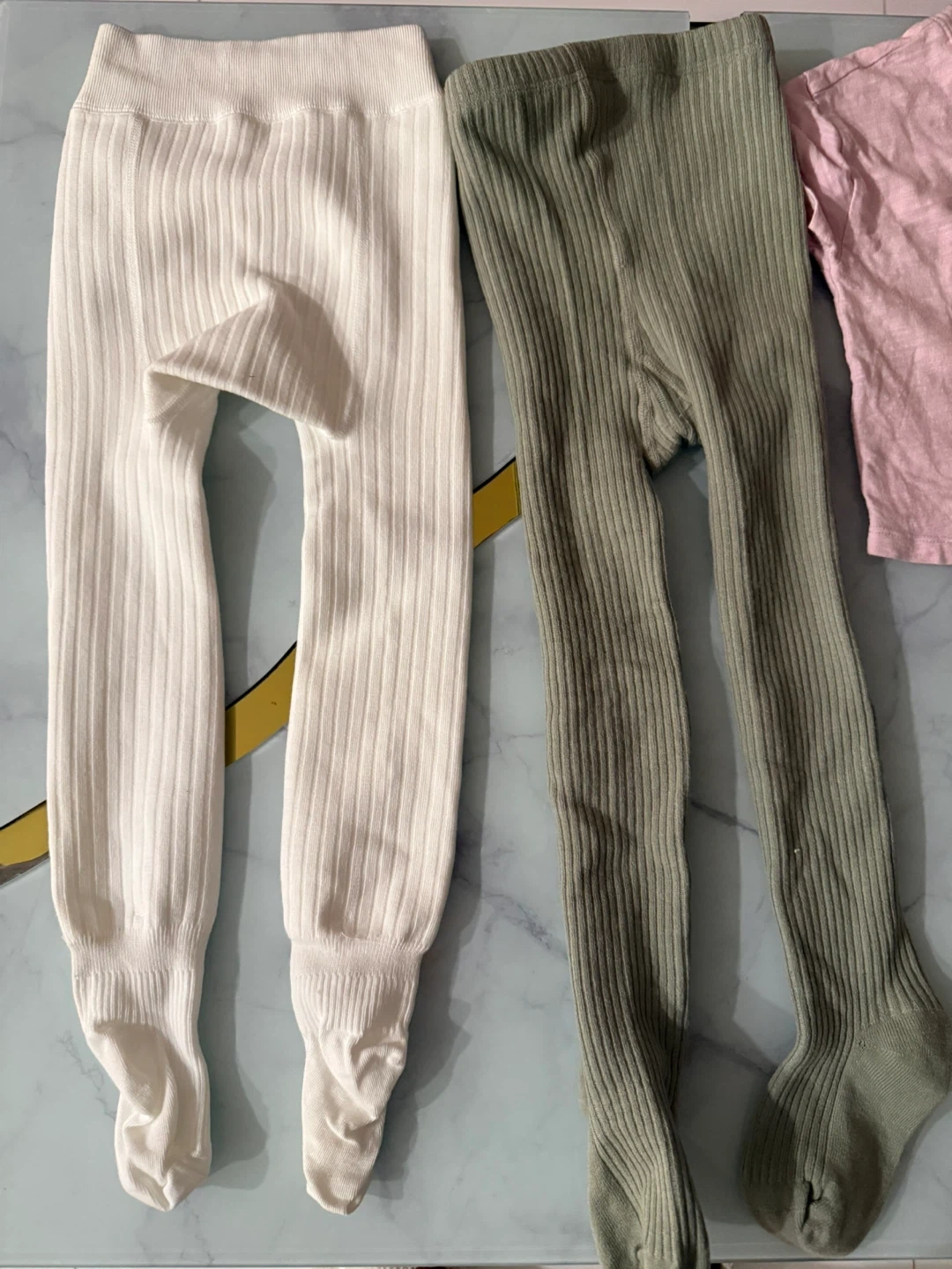 This bundle includes various girls' clothing items. Featured are denim jeans, ribbed tights in white and olive green, and a pink shirt. It's a great mix for everyday wear!